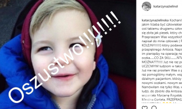„Kochani! Nie wiem jakim trzeba być człowiekiem, żeby zrobić coś takiemu drugiemu człowiekowi. Czuję się zbita jak piesek, który chciał dobrze. Przepraszam Was wszystkich. Tydzień temu napisał do mnie człowiek ( PO RAZ KOLEJNY!!!!!!) który podawał się za ojca przepięknego Antosia. Napisał, że brakuje im pieniędzy na operację nowotwora oczka……CO ZA SKU………ŃTWO. JAK TAK MOŻNA???!!!!! Już nie raz pomagałam UCZCIWYM ludziom w takich sytuacjach. Już nie raz prosiłam Was o pomoc. Już nie raz pomogliśmy małym, wspaniałym, dzielnym pacjentom, którzy cieszą się teraz nowymi oczkami, nowym serduszkiem. Namówiłam nie tylko Was, wspaniałych ludzi, do zbiórki dla Antosia. Namówiłam wspaniała Marzenę Rogalską, wspaniałego Marcina Gortata. PRZEPRASZAM WAS WSZYSTKICH. ??? Mam nadzieję, że każdemu z Was zostaną zwrócone pieniądze. Że OSZUST ZOSTANIE ZŁAPANY. Ja BĘDĘ nadal pomagać. BĘDĘ teraz stokrotnie sprawdzać prawdziwość informacji. Bo TRZEBA POMAGAĆ. A człowiekowi, który to zrobił nie życzę źle. Trzymam za niego kciuki, żeby karma, która wraca pomogła mu stać się DOBRYM CZŁOWIEKIEM. Jeszcze raz Was przepraszam. ???”
