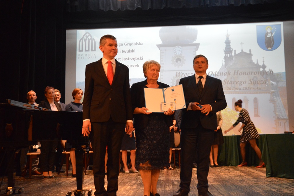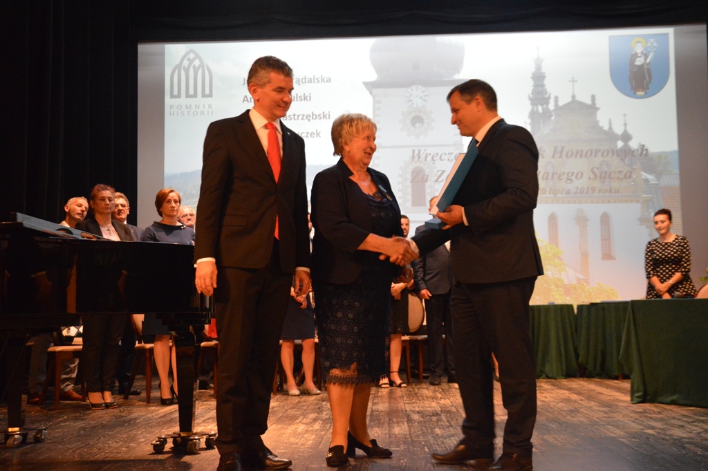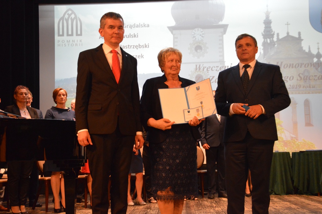 Ewa Zielińska, kobieta samorządu i tytan pracy odebrała z rąk burmistrza Jacka Lelka i przewodniczącego Rady Miejskiej Andrzeja Stawiarskiego Honorową Odznakę Starego Sącza. Uroczysta sesja odbyła się w Kinie Sokół 20 lipca 2019 r. Odznaczenie przyznano na wniosek burmistrza.