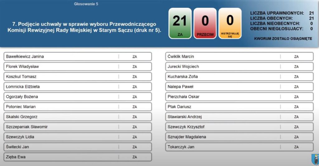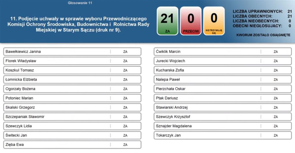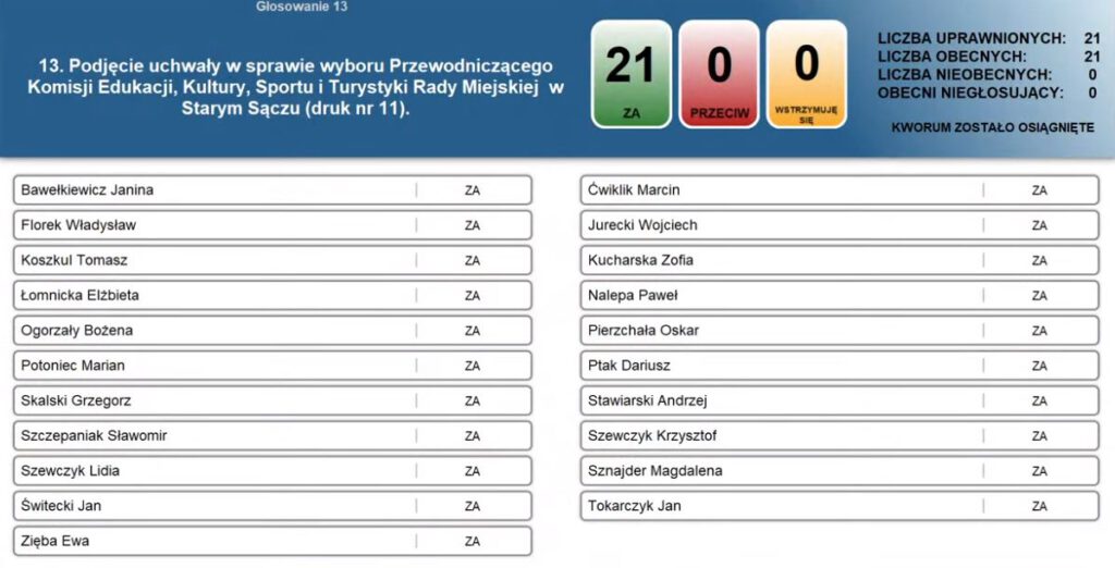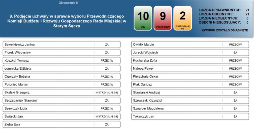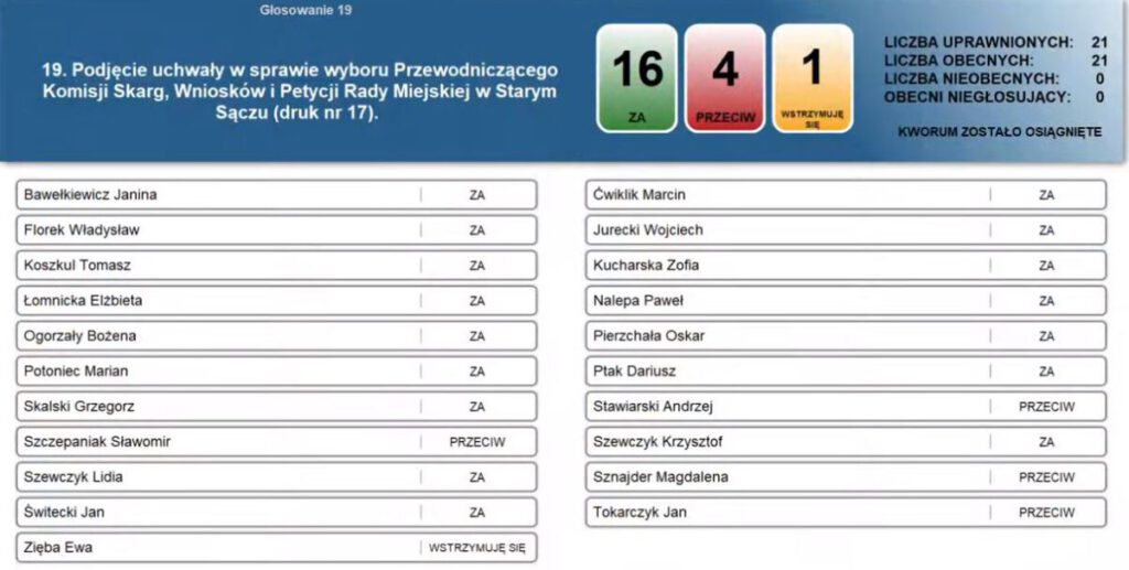 ZA kandydaturą Szewczyk Lidii byli: Bawełkiewicz Janina, Florek Władysław, Łomnicka Elżbieta, Jurecki Wojciech, Szewczyk Krzysztof, Koszkul Tomasz, Ogorzały Elżbieta, Potoniec Marian, Skalski Grzegorz, Szewczyk Lidia, Świtecki Jan, Ćwiklik Marcin, Pierzchała Oskar, Kucharska Zofia, Nalepa Paweł, Ptak Dariusz.