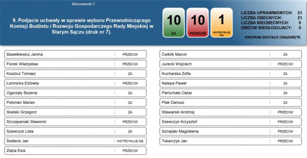 ZA kandydaturą Tomasza Koszkula głosowali: Koszkul Tomasz, Potoniec Marian, Skalski Grzegorz, Ogorzały Bożena, Szewczyk Lidia, Ćwiklik Marcin, Kucharska Zofia, Nalepa Paweł, Pierzchała Oskar i Ptak Dariusz.
