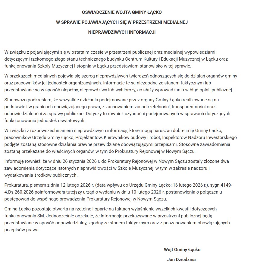 W Łącku narasta konflikt wokół Szkoły Muzycznej I stopnia – jednej z kluczowych instytucji kulturalno-edukacyjnych w regionie. Spór pomiędzy dyrektorem placówki a władzami gminy wyszedł poza mury szkoły i stał się przedmiotem publicznej debaty, budząc niepokój wśród rodziców i mieszkańców.