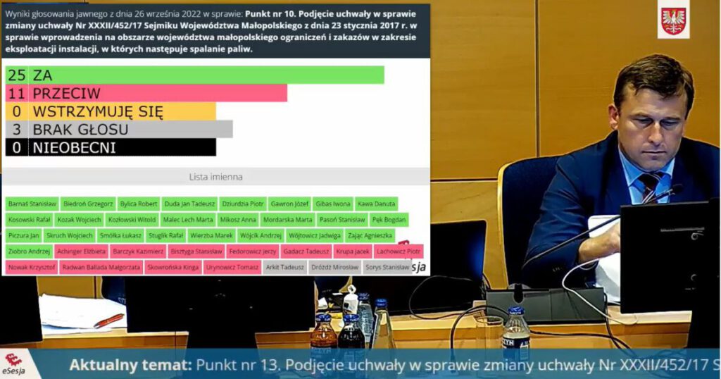 Po 7 godzinach debaty radni sejmiku Województwa Małopolskiego podjęli w tym momencie uchwałę ws. wydłużenia czasu na likwidację kopciuchów.