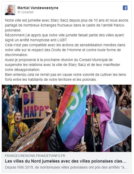 „Nasze miasto jest powiązane ze Starym Sączem od ponad 10 lat. Zainicjowaliśmy wspólnie wiele owocnych wymian w ramach francusko-polskiej przyjaźni. Ostatnio dowiedziałem się, że nasze miasto partnerskie jest jednym z miast, które podpisały homofobiczny dekret przeciwko LGBT. Jest to niezgodne z działaniami, które podejmujemy na rzecz walki o prawa człowieka i z wszelkimi formami dyskryminacji. Dlatego na najbliższym posiedzeniu rady gminy osobiście zawnioskuję o zawieszenie stosunków z miastem Stary Sącz, by w ten sposób okazać naszą dezaprobatę wobec ich homofobicznych działań. ” – napisał na Facebooku mer gminy Lambres-Lez-Douai, Martial Vandewoestyne.