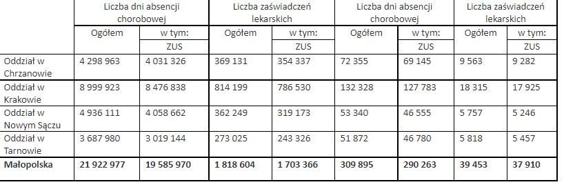 W ubiegłym roku w Małopolsce lekarze wystawili osobom ubezpieczonym w ZUS 1,7 mln zwolnień lekarskich, na łączną liczbę niemal 19,6 mln dni absencji chorobowej w pracy. W całym kraju liczba zwolnień sięgnęła 20,5 mln, a przyznano je na 239,9 mln dni.