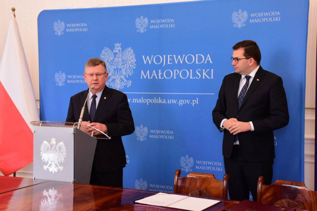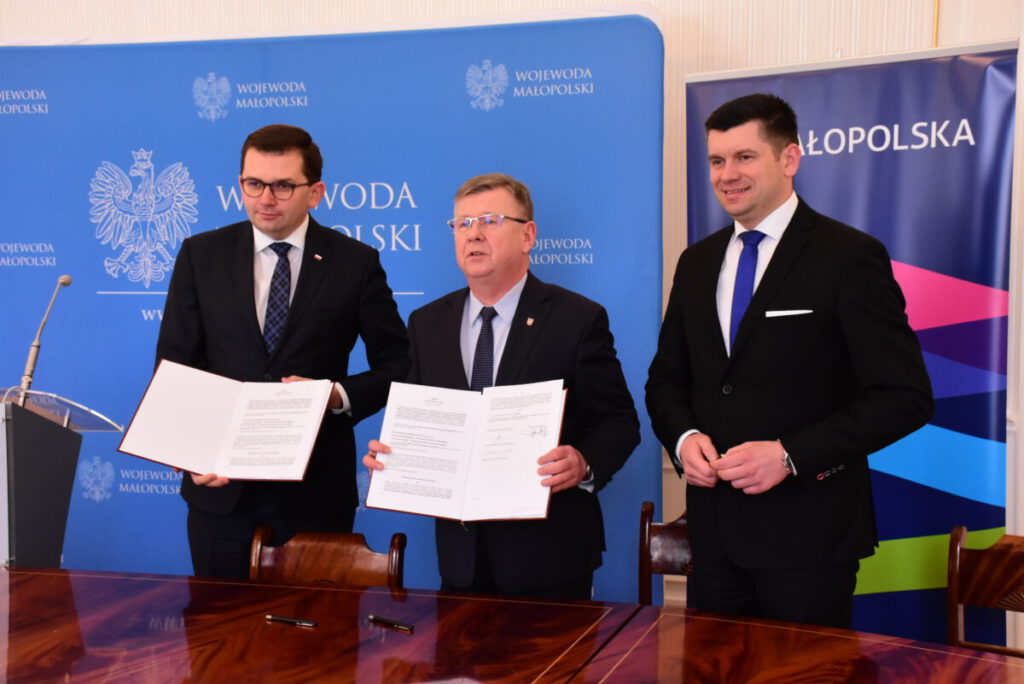 Sygnatariuszami umowy są wojewoda małopolski Łukasz Kmita, marszałek województwa małopolskiego Witold Kozłowski oraz wicemarszałek Łukasz Smółka.