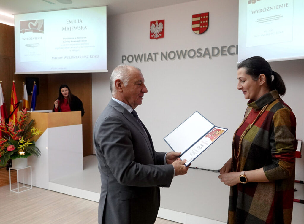 Jutro obchodzimy Międzynarodowy Dzień Wolontariusza, a ja już dzisiaj doceniłem osoby wyróżniające się i niosące bezinteresowną pomoc – mówił starosta nowosądecki Marek Kwiatkowski. – Z radością i dumą wręczyłem nagrody wolontariuszom dziękując za ich działalność. Życzyłem też, aby wolontariat nadal był źródłem ich wewnętrznej siły i satysfakcji, a wdzięczność i uśmiech tych, którym poświęcają swój czas, motywował ich do dalszego działania. Przyznane dzisiaj nagrody finansowe to wyraz wdzięczności i podziękowanie za wspieranie osób potrzebujących pomocy. To wyraz uznania dla tych, którzy codziennie podejmują inicjatywy służące poprawie życia mieszkańców, ale też wspierają kulturę i naukę. Starosta wręczał nagrody wraz z przewodniczącym rady Powiatu Nowosądeckiego Romanem Potońcem.