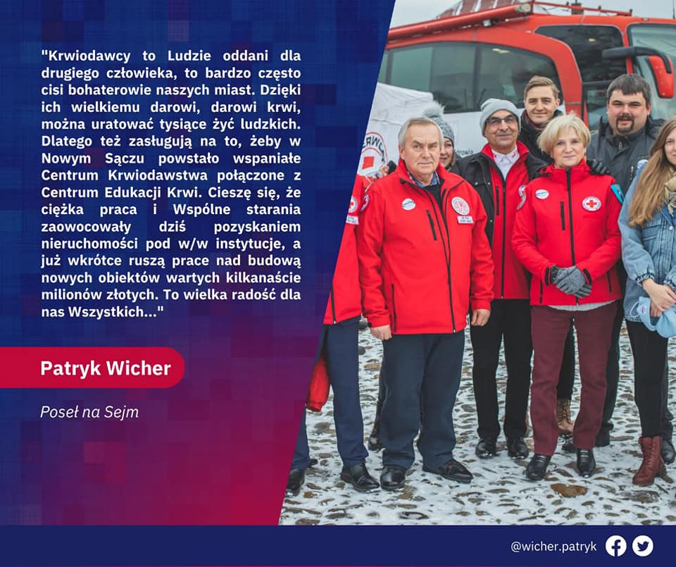To prawdziwy prezent na Gwiazdkę!!!! W Nowym Sączu powstanie Centrum Krwiodawstwa i Krwiolecznictwa. Obiekt zostanie połączony z Centrum Edukacji, w której odbywać się będą spotkania i prelekcje propagujące krwiodawstwo. Jak poinformował poseł Patryk Wicher w planach jest już budowa centrum krwiodawstwa w Limanowej i remont budynku w Zakopanym.