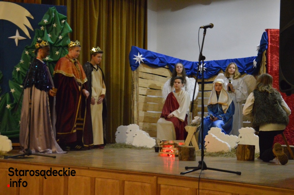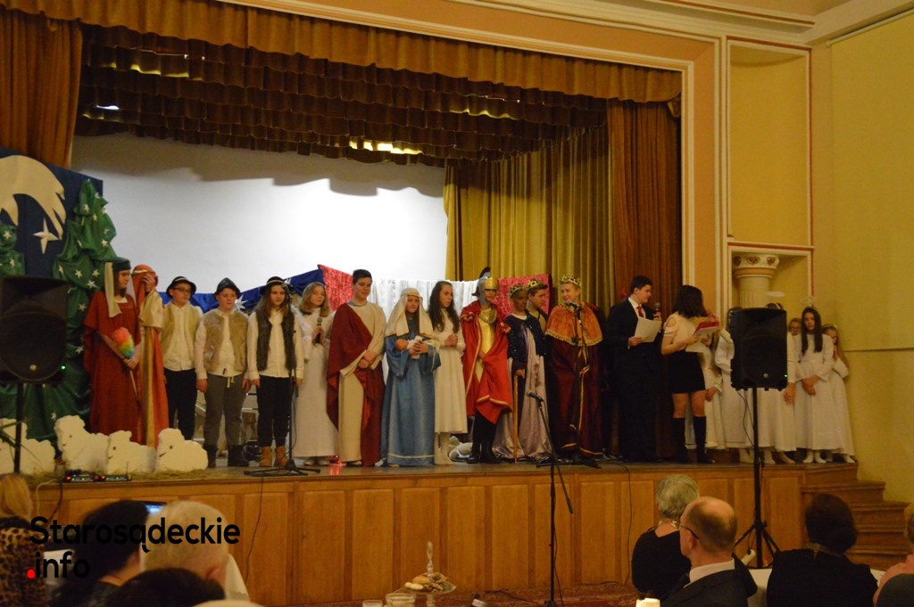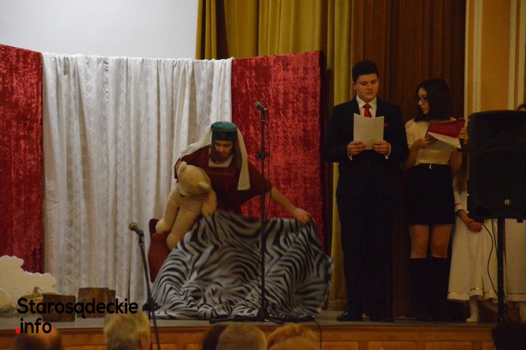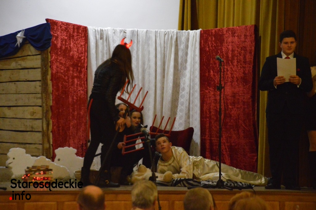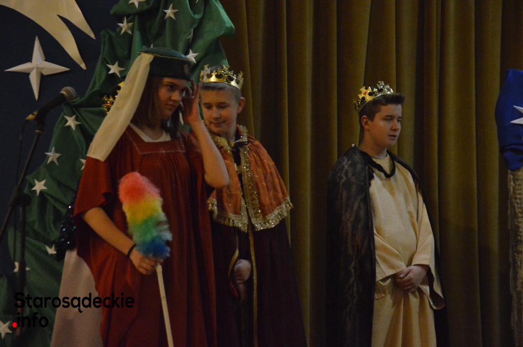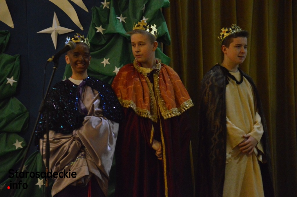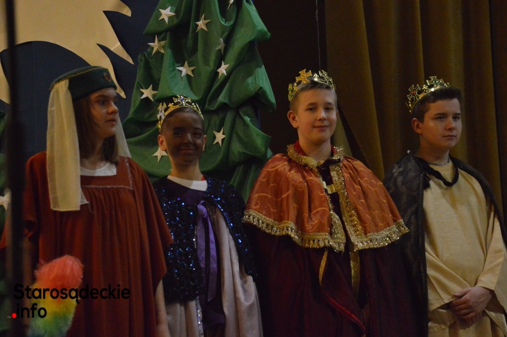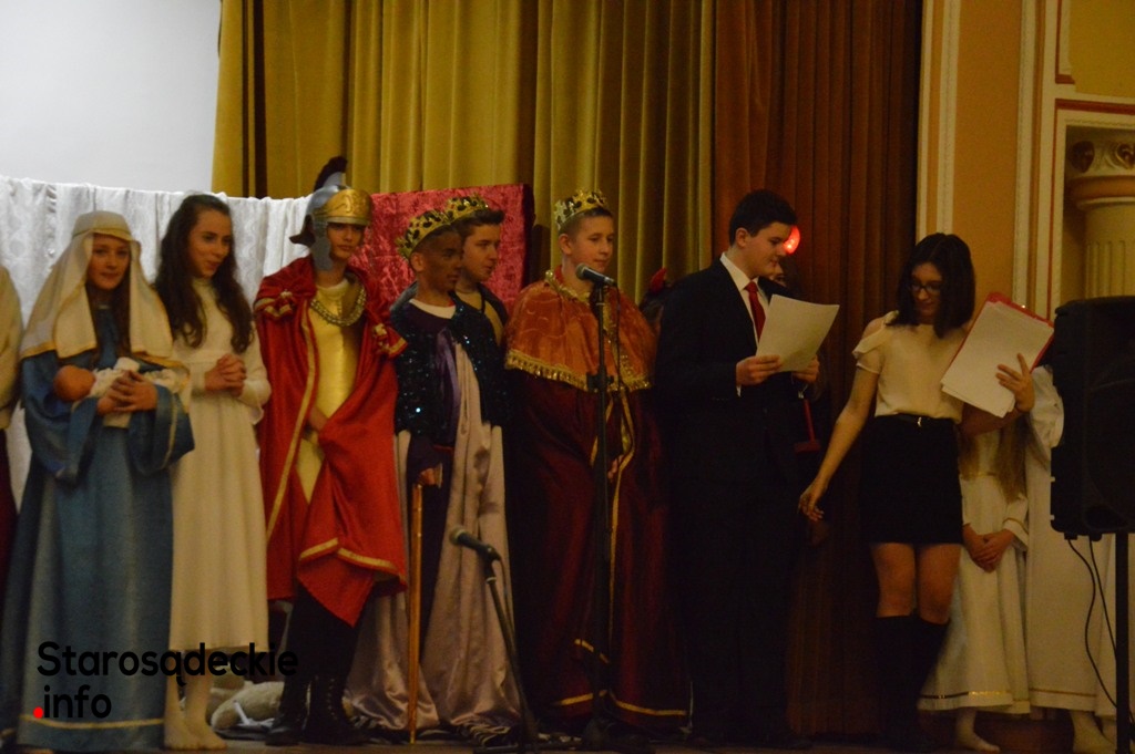 Na początku uczniowie klasy 7b i 7c ze Szkoły Podstawowej nr 2 im. Juliusza Słowackiego przedstawili ,, Jasełka na wesoło”. Na scenie można było dostrzec Maryję, Józefa, pastuszków, anioły, Trzech Króli, Jagnę, Hetmana, Heroda oraz diabły. Inicjatorkami przedstawienia były pani Agata Kurowska oraz pani Małgorzata Wąchała. Aktorzy za ciężką pracę i czas poświęcony na stworzenie spektaklu zostali nagrodzeni gromkimi brawami oraz licznymi uśmiechami. Obstawę muzyczną stanowiły czwartoklasistki oraz dwóch uczniów gimnazjum.