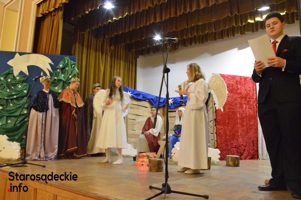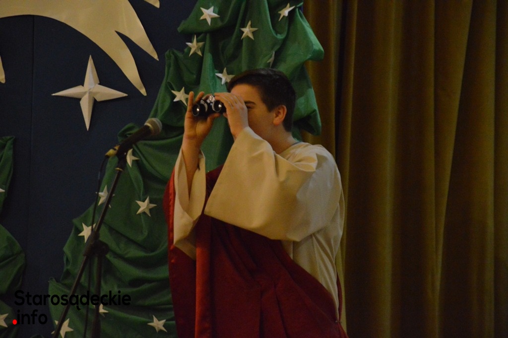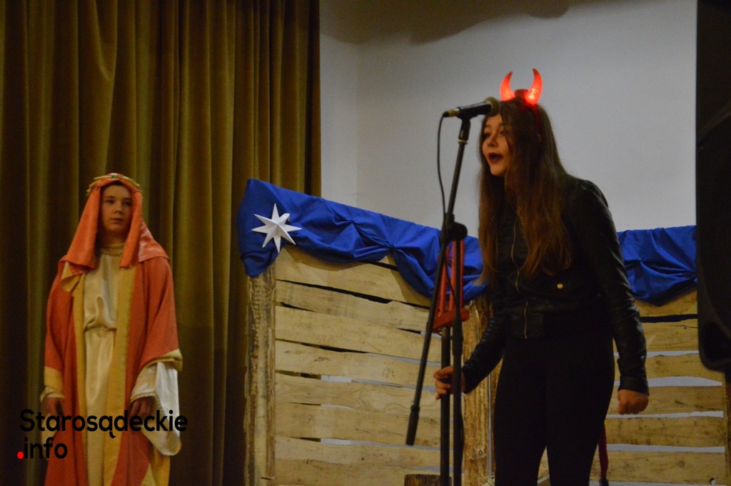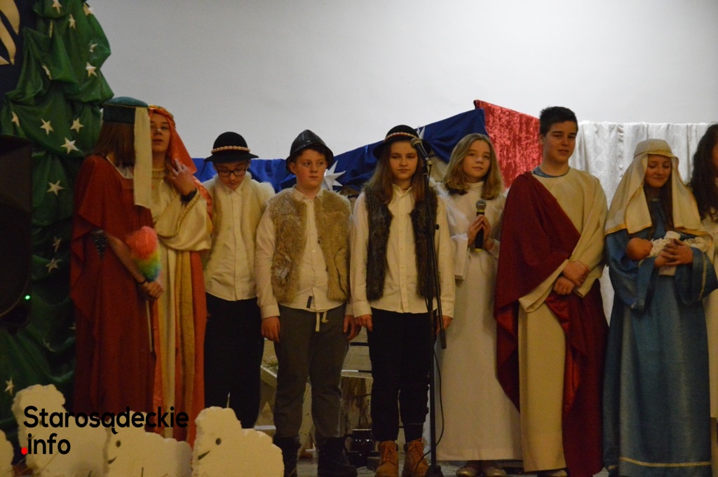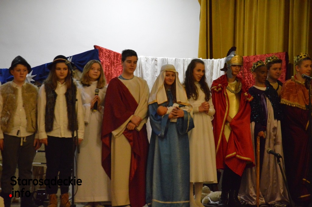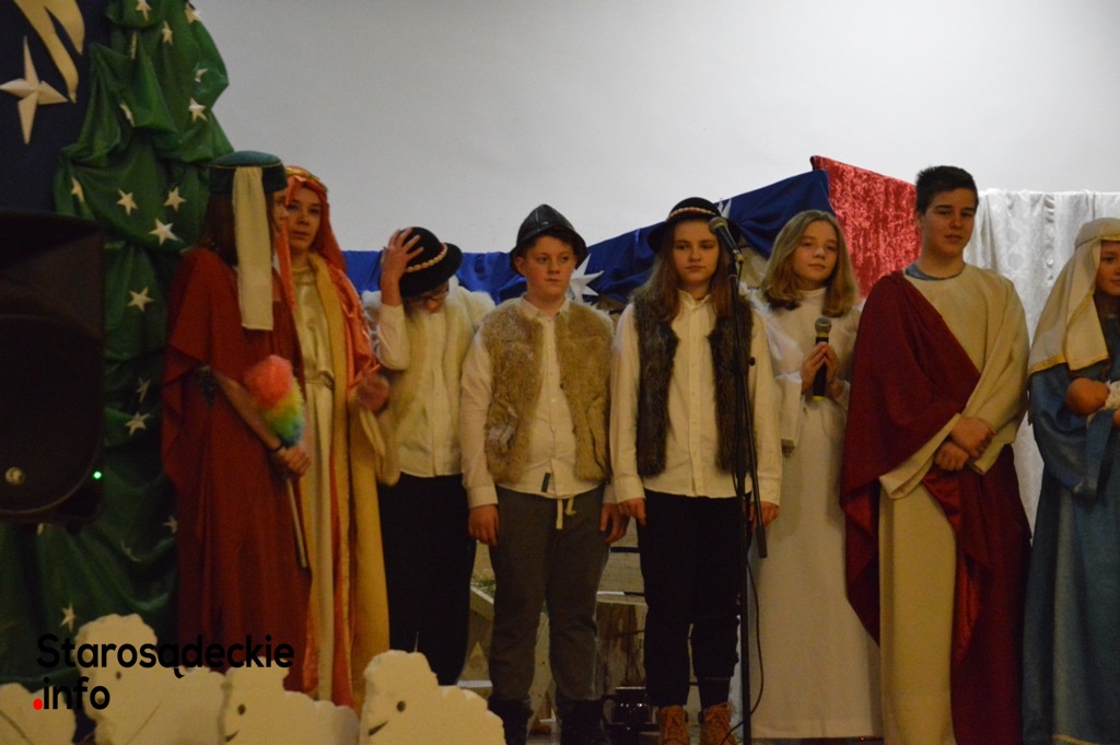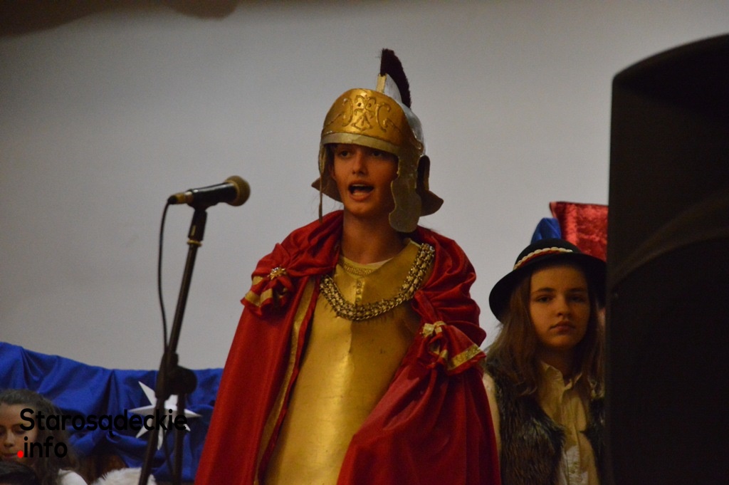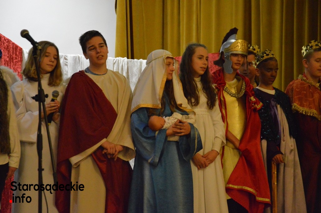 Na początku uczniowie klasy 7b i 7c ze Szkoły Podstawowej nr 2 im. Juliusza Słowackiego przedstawili ,, Jasełka na wesoło”. Na scenie można było dostrzec Maryję, Józefa, pastuszków, anioły, Trzech Króli, Jagnę, Hetmana, Heroda oraz diabły. Inicjatorkami przedstawienia były pani Agata Kurowska oraz pani Małgorzata Wąchała. Aktorzy za ciężką pracę i czas poświęcony na stworzenie spektaklu zostali nagrodzeni gromkimi brawami oraz licznymi uśmiechami. Obstawę muzyczną stanowiły czwartoklasistki oraz dwóch uczniów gimnazjum.