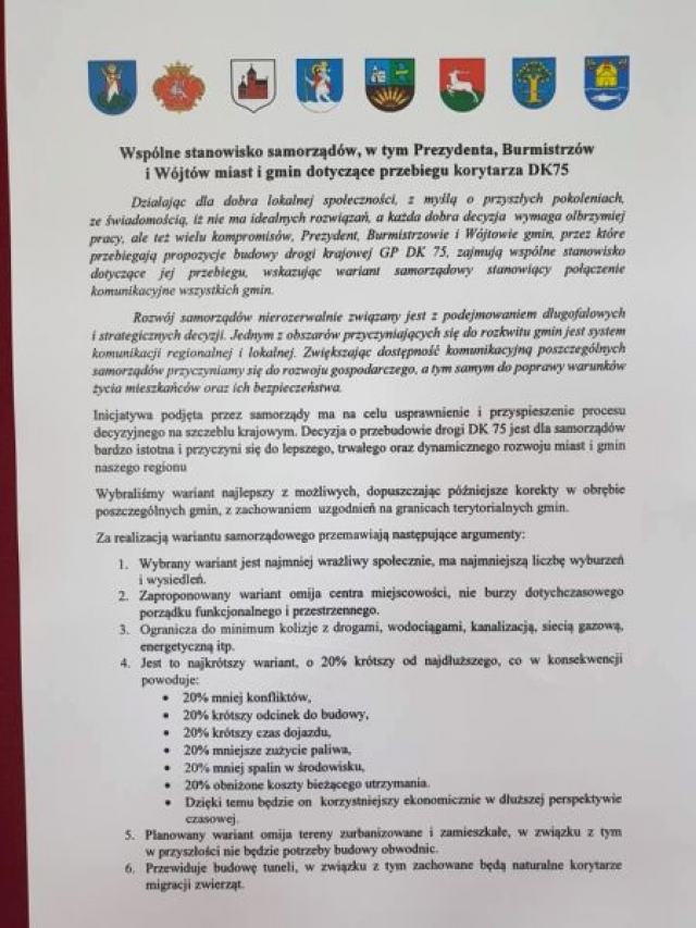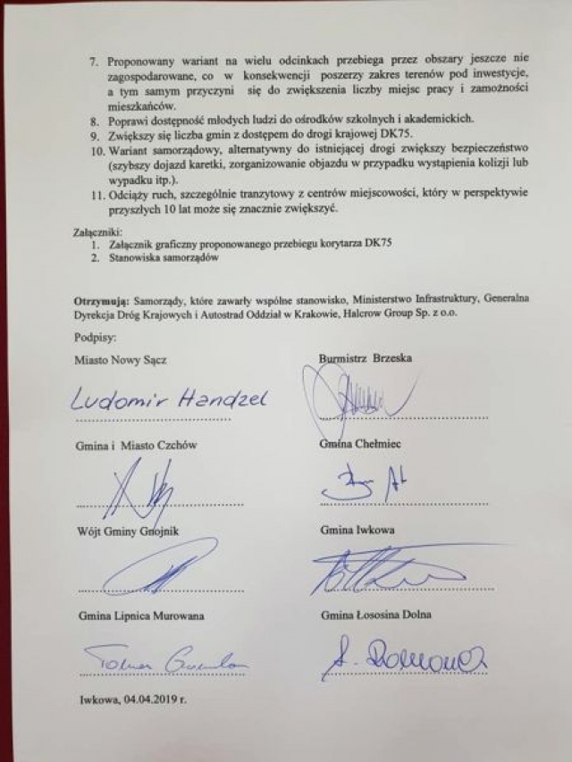 Wspólne stanowisko w sprawie drogi podpisali 4 kwietnia w Iwkowej prezydent Nowego Sącza oraz włodarze: Brzeska, Chełmca, Iwkowej, Łososiny Dolnej, Lipnicy Murowanej, Gnojnika, Czchowa.