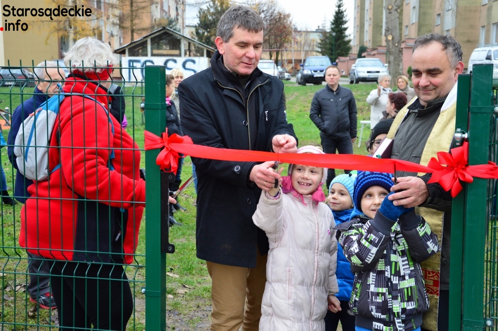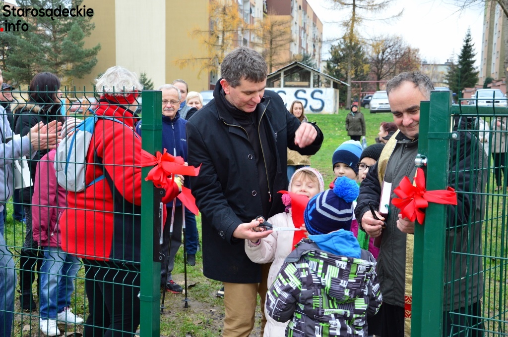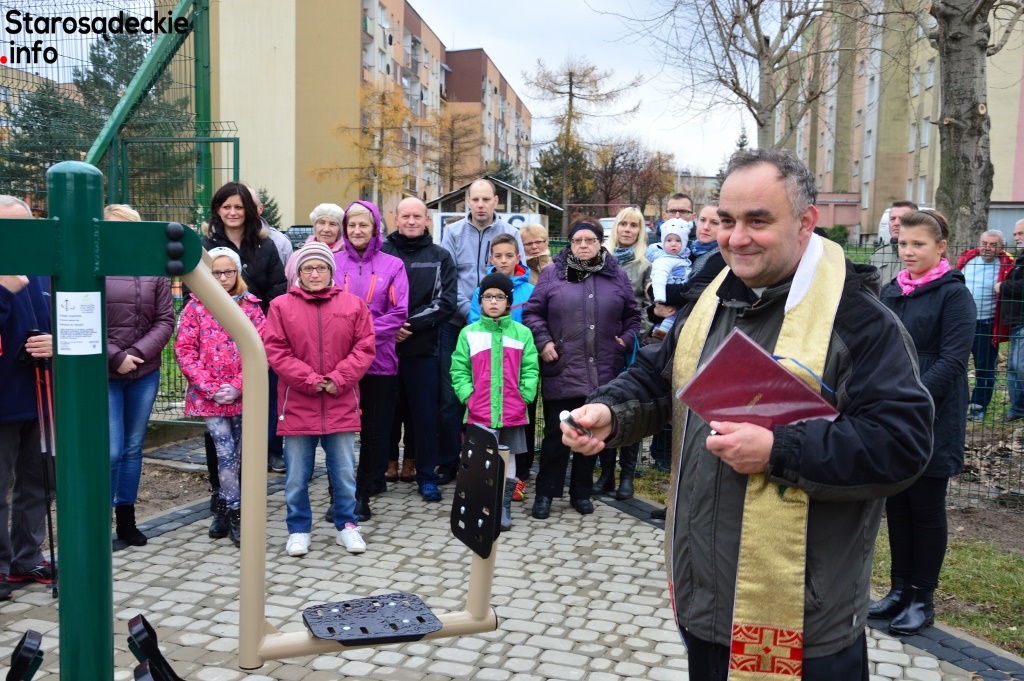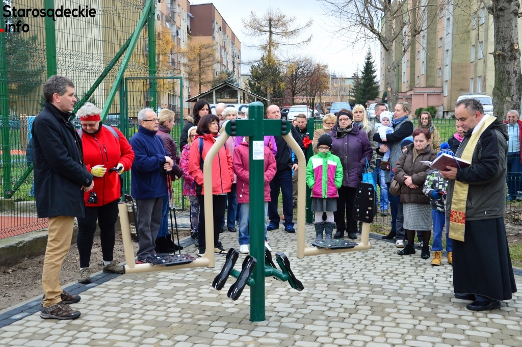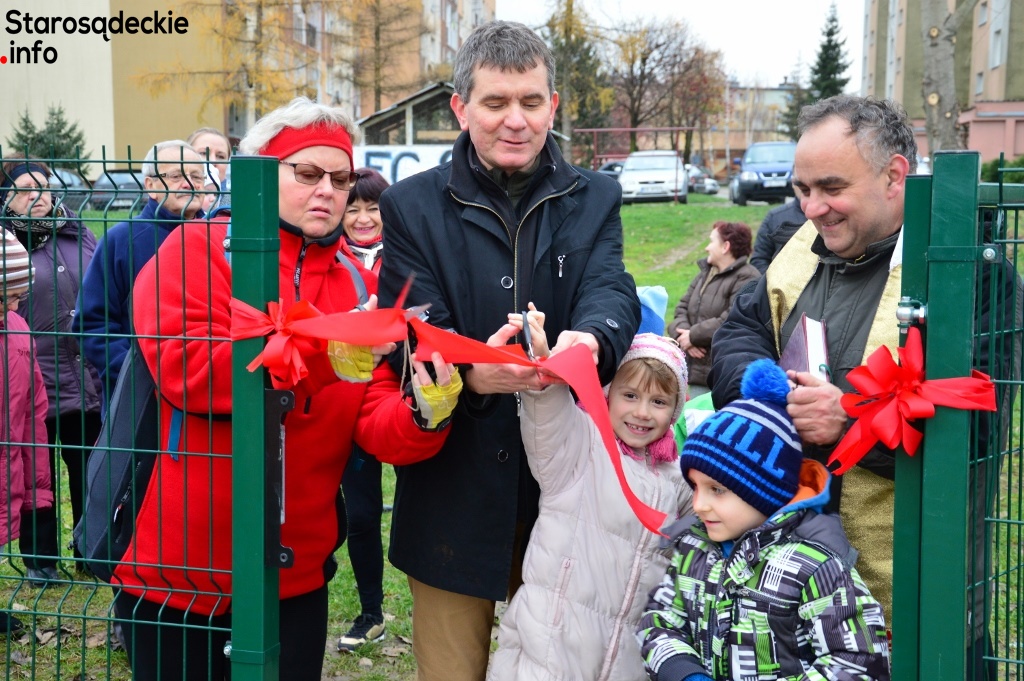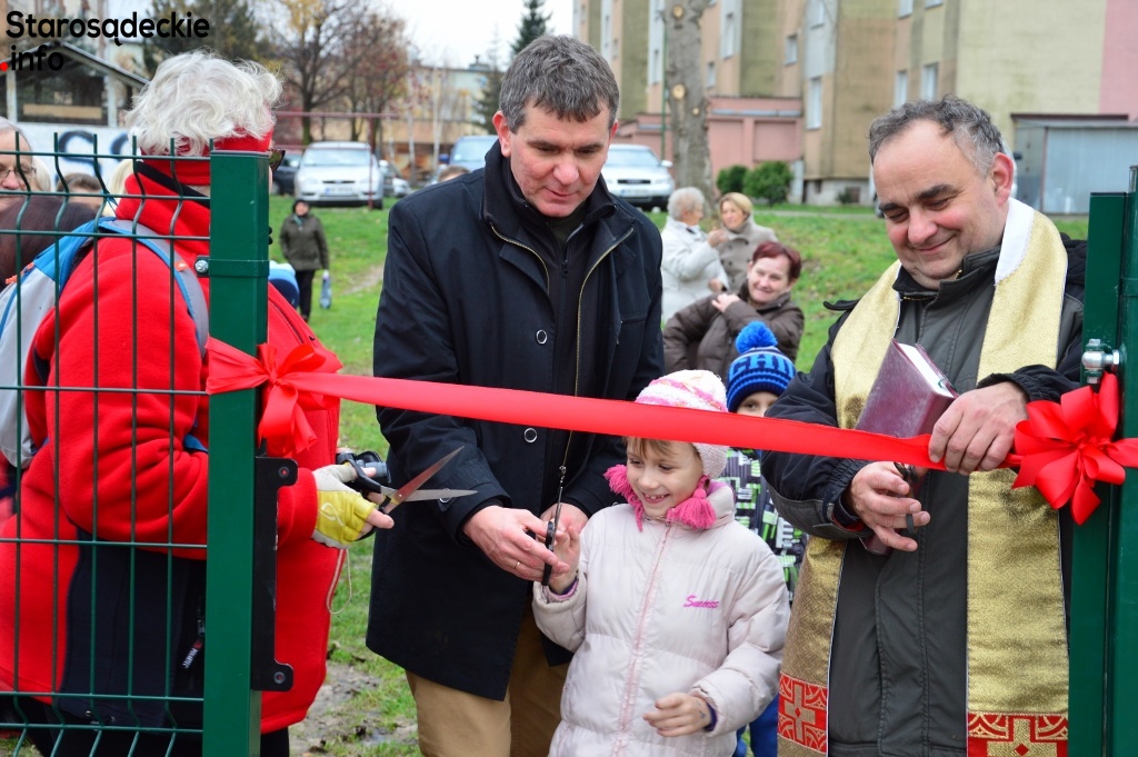 Na placu zlokalizowanym w sąsiedztwie z boiskiem i placem zabaw zgromadzili się mieszkańcy, burmistrz Jacek Lelek, przewodniczący Osiedla Marcin Szmigiel wraz z Zarządem, radna Osiedla Julia Dziedzic , radny Osiedla Śródmieście Sławomir Szczepaniak oraz ks proboszcz Janusz Ryba, który poświęcił nowo powstały obiekt.