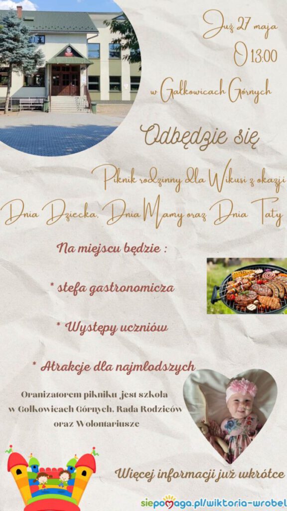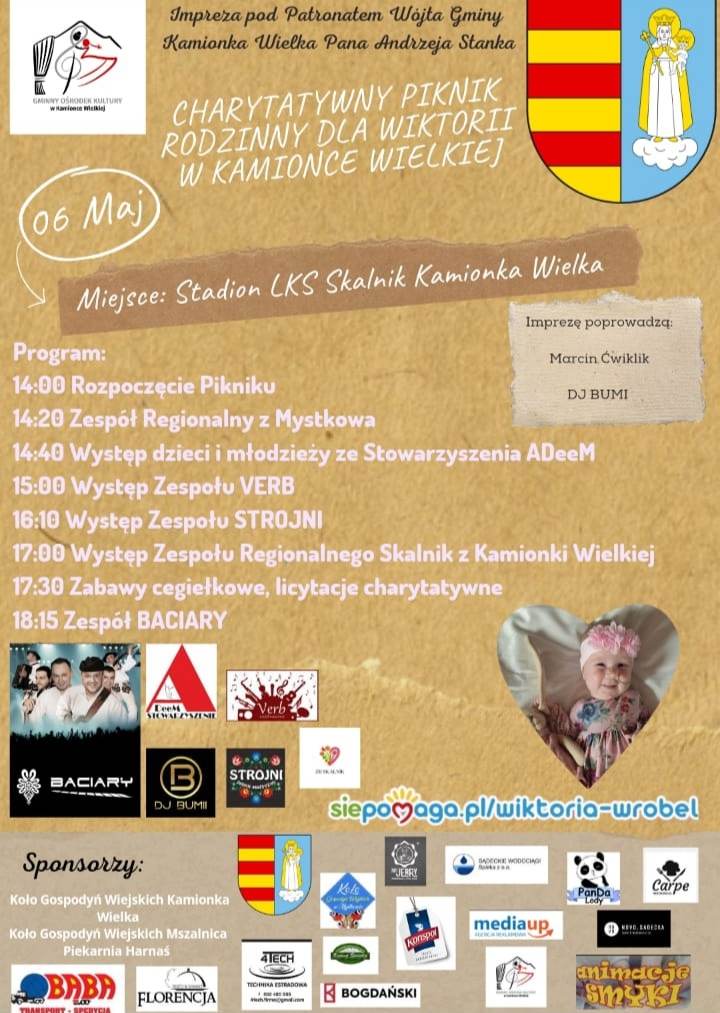 Czas działa na niekorzyść Wiktorii. Jeśli dziewczynka osiągnie wagę 13 kg lek nie będzie mógł zostać podany. Dlatego już 6 maja na stadionie Skalnik w Kamionce Wielkiej odbędzie się koncert charytatywny a gwiazdą wieczoru będzie zespół Baciary. Z kolei 27 maja zapraszamy na wspólne świętowanie Dnia Mamy, Ojca i Dziecka i wspólny piknik w Gołkowicach. 27 maja na hali MOSiR w Nowym Sączu odbędzie się także charytatywny maraton Zumby. Cały dochód z tych imprez zostanie przekazany na lek dla chorej Wiktorii Wróbel.
