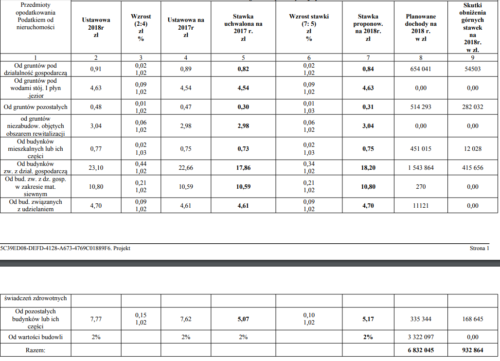 –Wpływy z podatku od nieruchomości stanowią znaczące źródło dochodów własnych budżety gminy. Kreując gminną politykę podatkową proponuje się częściowo stawki niższe od ustawowych wspierając tym samym przedsiębiorców na naszym terenie. Przy zastosowaniu stawek proponowanych dochody z podatku o nieruchomości na 2018 r. szacuje się na kwotę około 6 832 046 zł, co daje wzrost dochodów w stosunku do dochodów w 2017 r. o kwotę 79 736 zł -czytamy w dalszym uzasadnieniu projektu uchwały.