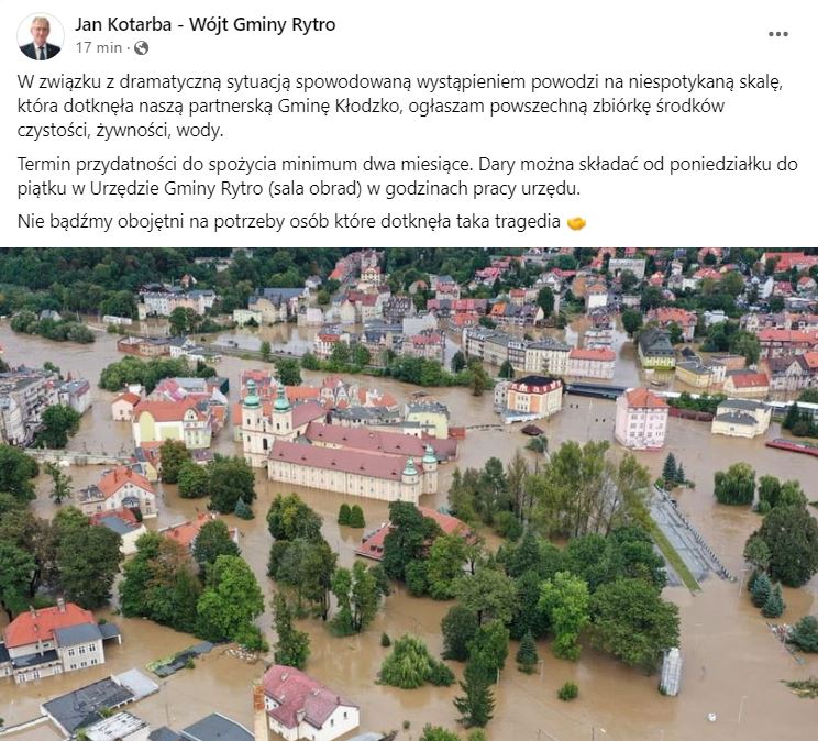 W regionie ruszyły już pierwsze zbiórki. Wójt Rytra ogłosił wsparcie dla Kłodzka, partnerskiego miasta.