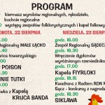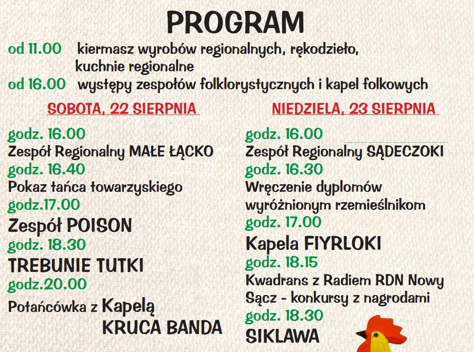 Wystąpią m.in.: TREBUNIE TUTKI, Zespół Siklawa, Kapela FIYRLOKI, Zespół POISON, Dziecięcy Zespół Regionalny MAŁE ŁĄCKO i Zespół Regionalny SĄDECZOKI.