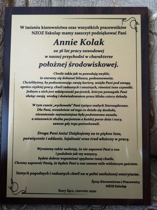 Przez te dziesięciolecia „przez ręce” pielęgniarki przewinęły się dziesiątki tysięcy matek i dzieci. Zna doskonale twarze swoich „podopiecznych”. Stworzyła w przychodni rodzinną atmosferę. Widać to było podczas pożegnania, kiedy to w niejednym oku zakręciła się łza.