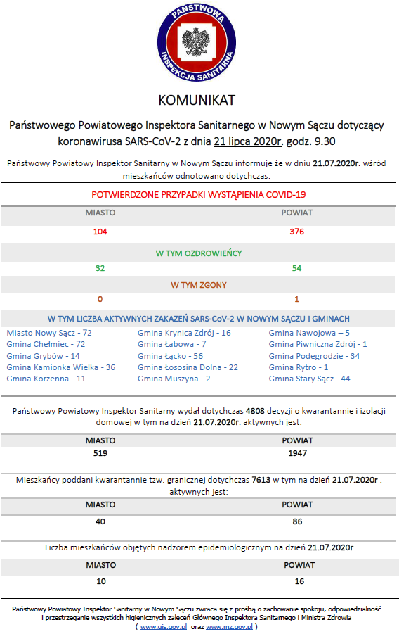 Natomiast ostatnie badania laboratoryjne potwierdziły zakażenie koronawirusem SARS-CoV-2 u kolejnych osób. To 29 kobiet i 33 mężczyzn, w wieku od 6 do 92 lat, z powiatu nowosądeckiego (29 osób), wadowickiego (11 osób), Nowego Sącza (10 osób), Krakowa i powiatu bocheńskiego (po 3 osoby), powiatu oświęcimskiego (2 osoby) oraz limanowskiego, nowotarskiego, suskiego i wielickiego (po 1 osobie). Aktualnie 4 osoby są hospitalizowane, pozostałe przebywają w izolacji.