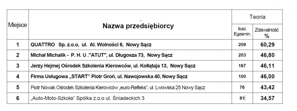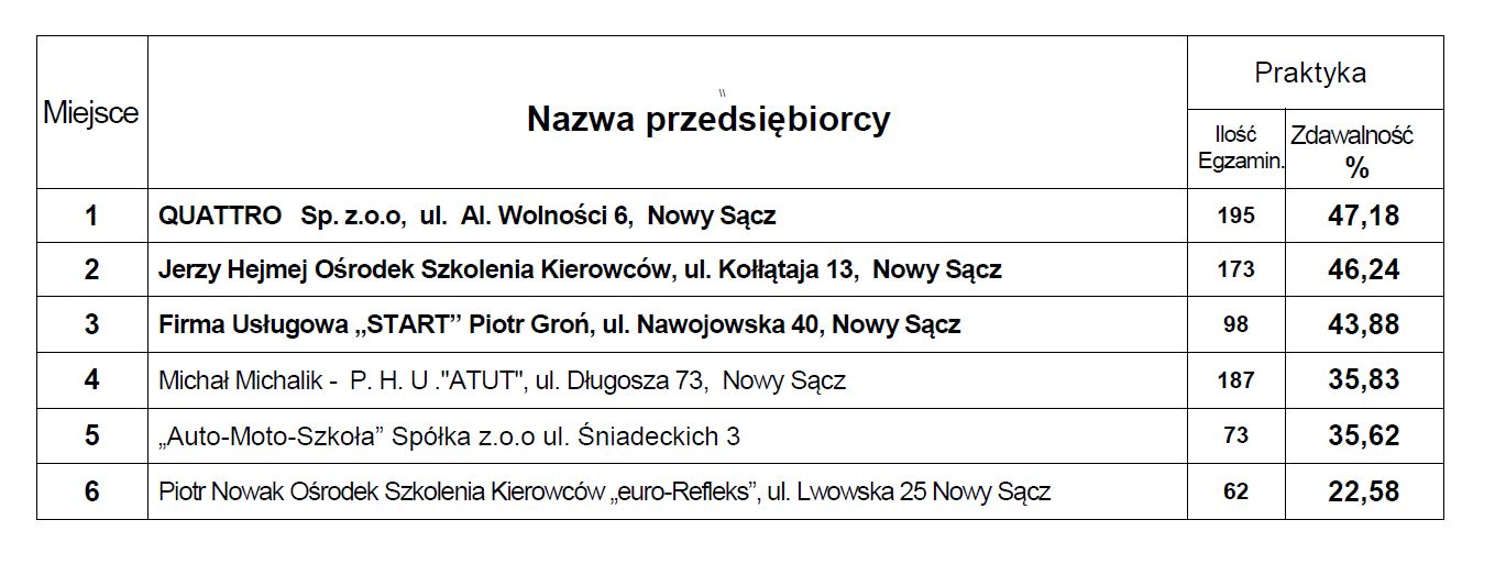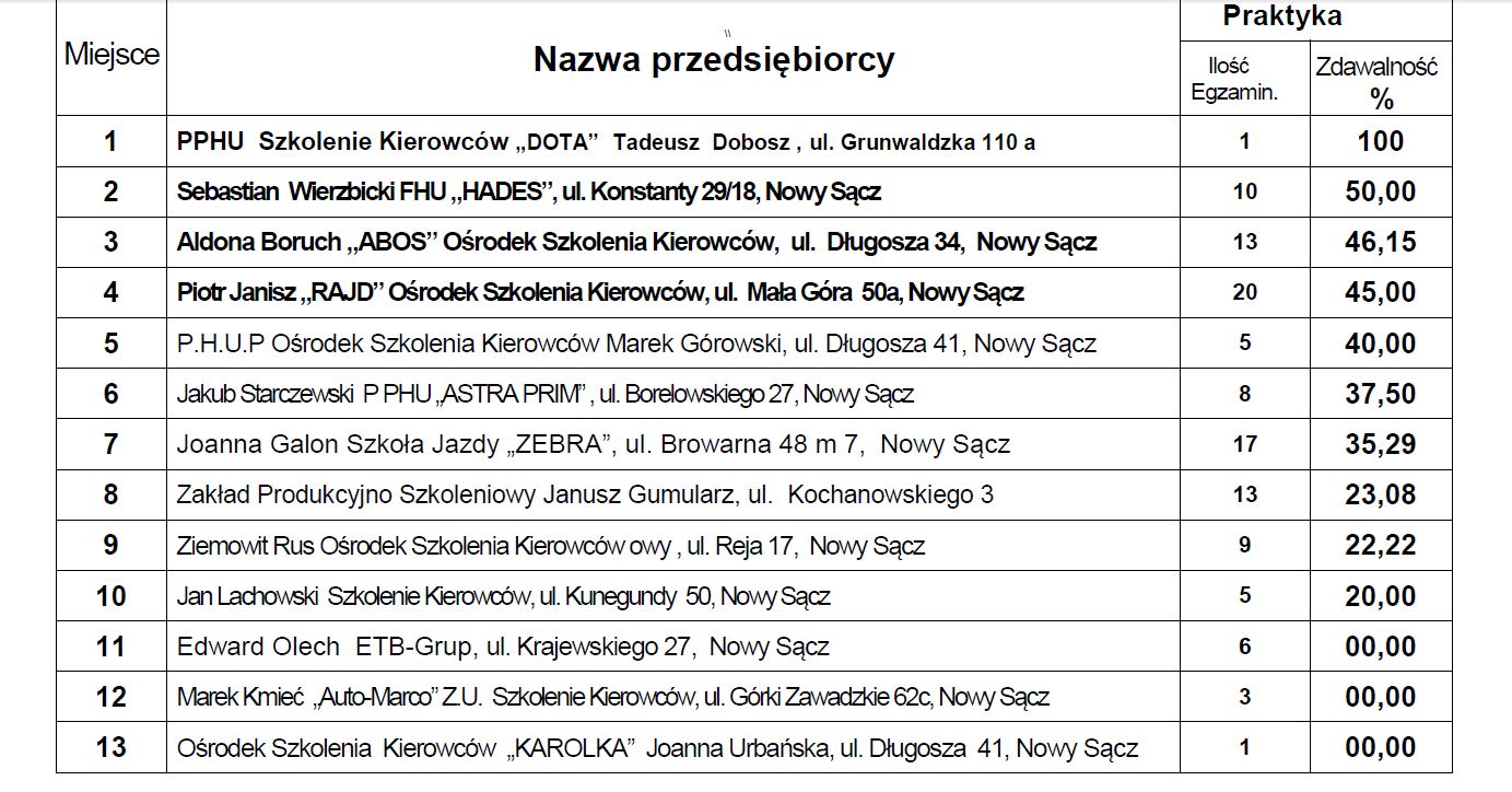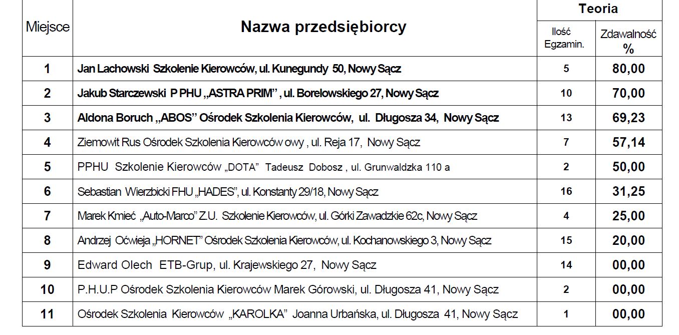 W grupie od od 1 do 20 osób najlepsze wyniki z teorii ma szkoła jazdy Jan Lachowski Szkolenie Kierowców, ul. Kunegundy 50, Nowy Sącz  (80 procent) a egzamin praktyczny -najlepsze wyniki osiągnął ośrodek „DOTA” –Tadeusz Dobosz , ul. Grunwaldzka 110 a (100 procent)
