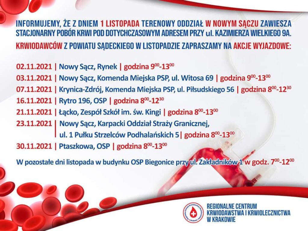 Centrum Krwiodawstwa i Krwiolecznictwa w Nowym Sączu wyprowadził się z kamienicy przy ul. Kazimierza 9a i tymczasowo stacjonuje w remizie OSP w Biegonicach. Początkiem roku przeniesie się do budynku przy ulicy Kochanowskiego 15. Jest to lokal w budynku, w którym mieści się przychodnia