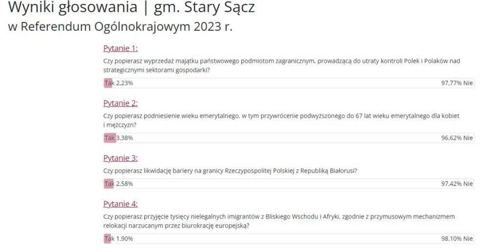 57,66% mieszkańców Gminy Stary Sącz wzięło udział w tegorocznym referendum. Tak wynika z oficjalnych danych PKW. Ogólna frekwencja w wyborach wyniosła 73%.