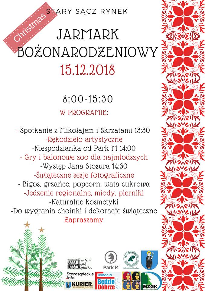 Będą mieli Państwo okazję zakupić rękodzieło artystyczne, prezenty bożonarodzeniowe, kosmetyki naturalne, wianki, światełkamówi naszemu portalowi Ewelina Wiśniewska z Galerii pod Piątką, koordynatorka JarmarkuDla smakoszy tych dużych i małych przygotowaliśmy miody, pierniki, zdrową żywność, jedzenie regionalne, bigos i wile więcej. We wnętrzach Galerii pod 5 Studio fotograficzne A4 Design będzie wykonywać sesje świąteczne. Dzięki współpracy z Fundacją Będzie Dobrze do Starego Sącza zawita Św. Mikołaj wraz z krztami, którzy będą rozdawać prezenty i poprowadzą konkursy dla najmłodszych. Nawet balonowe zoo się u nas pojawi, tak aby wywołać uśmiech na twarzach wszystkich dzieci. Na scenie wystąpi młody zdolny artysta Jan Stosur. Park M przygotował dla odwiedzających jarmark niespodzianki! Dzięki uprzejmości Nadleśnictwa Stary Sącz będziecie mieć szansę zabrać do domu żywe drzewko- choinkę.