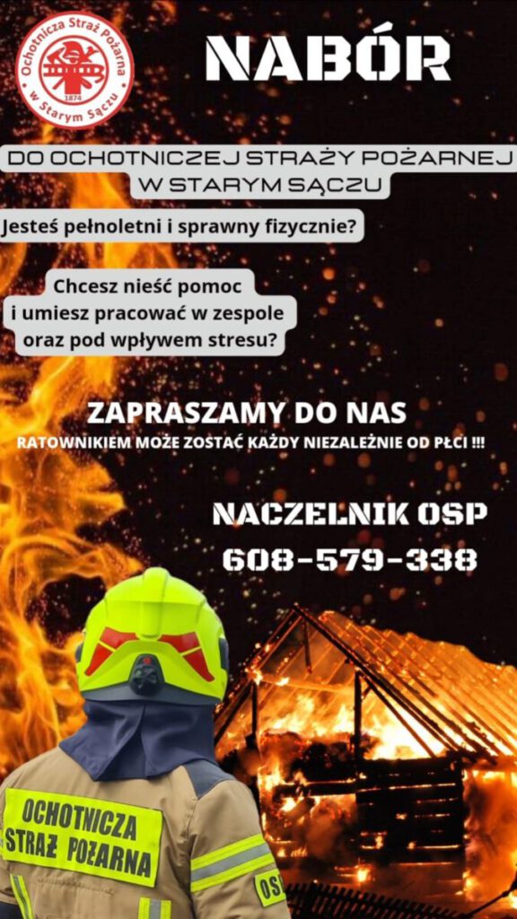 Ochotnicza Straż Pożarna w Starym Sączu szuka chętnych do wstąpienia w swoje szeregi. Zgłosić może się każda pełnoletnia i sprawna fizycznie osoba niezależnie od płci. Ważna jest umiejętność pracy w zespole, szczególnie pod wpływem stresu.