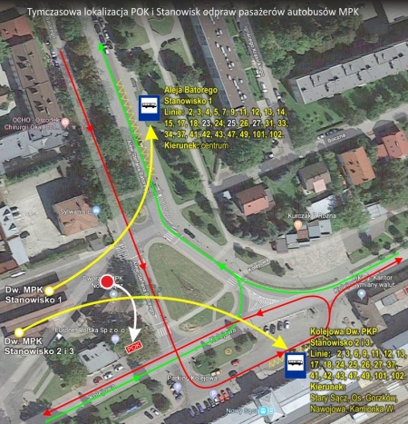 – kursy wykonywane ze stanowiska 2, kierunek: ul. Zielona, Węgierska i Stary Sącz (linie nr 6, 9, 11, 12, 17, 18, 24, 25, 27, 43, 47, 49) i ze stanowiska 3, kierunek: ul. Nawojowska, os. Gorzków, Nawojowa i Kamionka Wielka (linie nr 2, 3, 13, 26, 37, 41, 42, 101, 102) będą zlokalizowane przy ul. Kolejowej przed budynkiem dworca PKP,