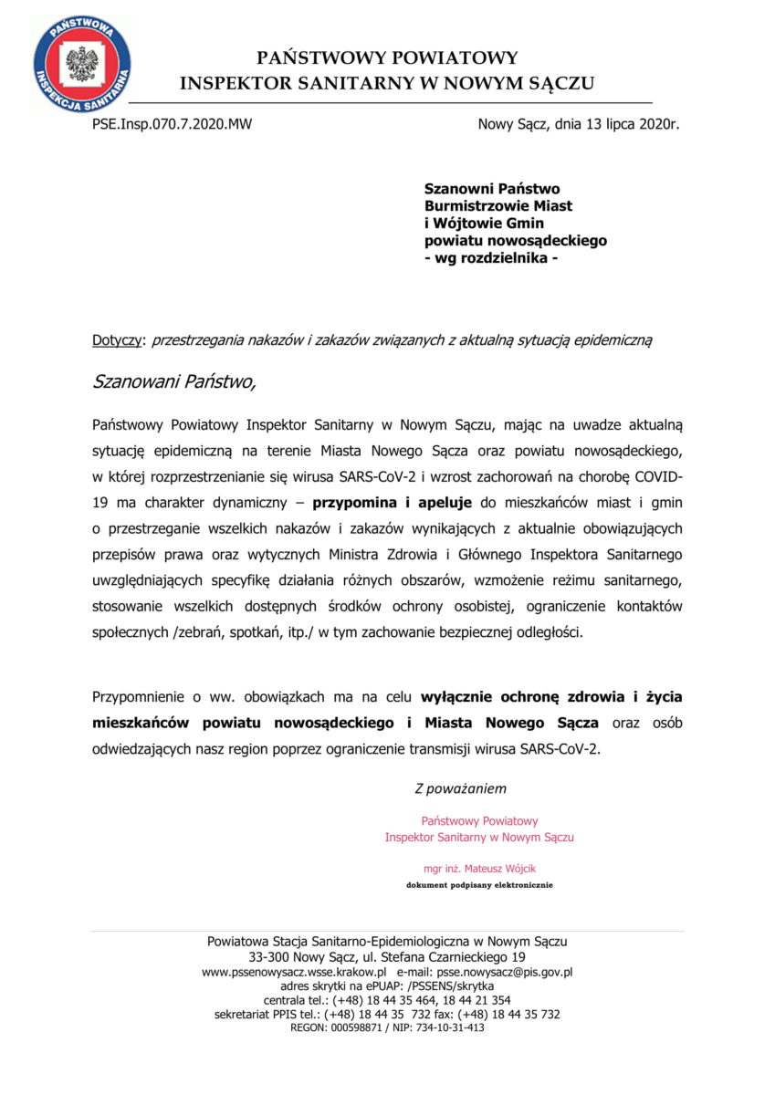Rośnie liczba zakażeń COVID-19 na Sądecczyźnie. Państwowy Powiatowy Inspektor Sanitarny w Nowym Sączu wydał komunikat dla mieszkańców powiatu nowosądeckiego i miasta Nowego Sącza, w którym apeluje o przestrzeganie obowiązujących nakazów i zaleceń związanych z panującą epidemią.