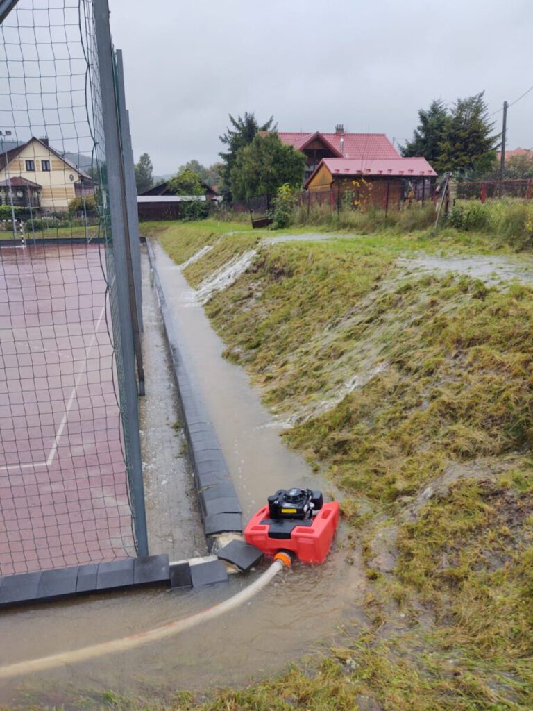 We wsi Królowa Polska został zalany teren szkoły podstawowej. Uczniowie musieli opuścić placówkę, bo woda wdarła się do budynku. Strażacy workami z piaskiem zabezpieczyli budynek przed dalszym napływem wody.