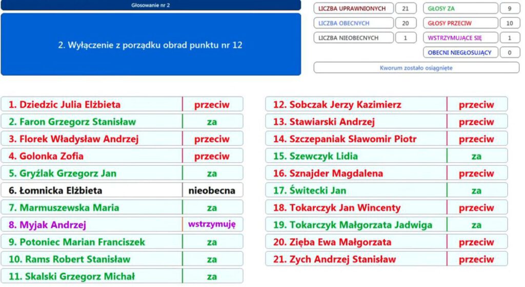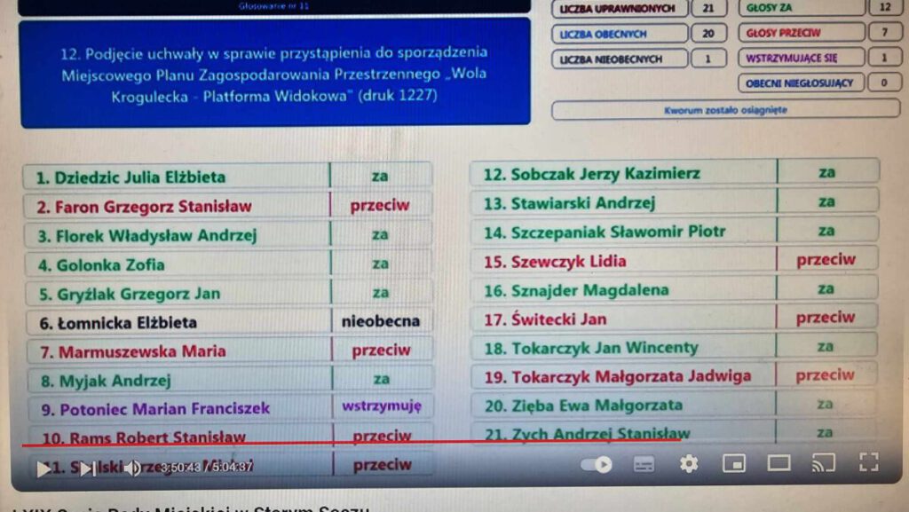 Uchwały nie usunięto z obrad. Ostatecznie 12 radnych (Dziedzic, Gryźlak, Myjak, Florek, Golonka, Sobczak, Stawiarski, Szczepaniak, Sznajder, Tokarczyk, Zięba i Zych) przegłosowało, że Rada pochyli się nad uchwałą zagospodarowania przestrzennego.