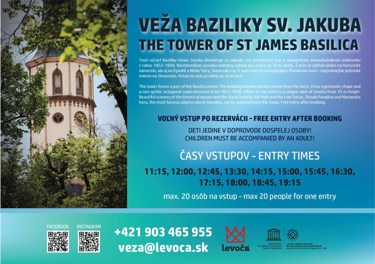 Mieszkańcy i turyści mogą już podziwiać widoki na miasto i okolicę z wieży bazyliki Świętego Jakuba. Bazylika, jak i cała Lewocza warta jest odwiedzenia nie tylko z tego powodu. W obrębie prostokątnego Placu Mistrza Pawła znajduje się ponad 60 gotyckich i renesansowych domów mieszczańskich, przeważnie z XIV i XV wieku. W samym jego środku znajdują się ewangelicki kościół, renesansowy ratusz, dzwonnica i Bazylika mniejsza św. Jakuba z unikatowym zbiorem późnogotyckich, renesansowych i barokowych ołtarzy. Ołtarz główny św. Jakuba jest najwyższym (18,62 m) późnogotyckim drewnianym ołtarzem szafiastym na świecie. Ukończony został w 1510 roku przez Mistrza Pawła i jego uczniów. Mistrz Paweł z Lewoczy, spiski rzeźbiarz z początku XVI wieku, należał do najwybitniejszych średniowiecznych rzeźbiarzy. W wieży bazyliki znajduje się Informacja Turystyczna, w której można znaleźć gry miejskie dotyczące historii Lewoczy w języku polskim. Projekt remontu wieży jest powiązany bowiem z nową aplikacją na urządzenia mobilne – Stary Sącz i Lewocza szlakiem tajemnic, która powstała w ramach transgranicznego projektu.