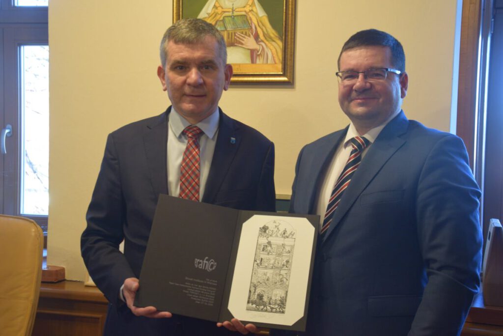 Instytut Słowacki w Warszawie świętuje w tym roku 25-lecie działalności. Plany uroczystości przekreśliła pandemia, ale dyrektor instytutu Adrián Kromka odwiedził Stary Sącz i wręczył burmistrzowi Jackowi Lelkowi pamiątkową grafikę przygotowaną specjalnie na jubileusz.