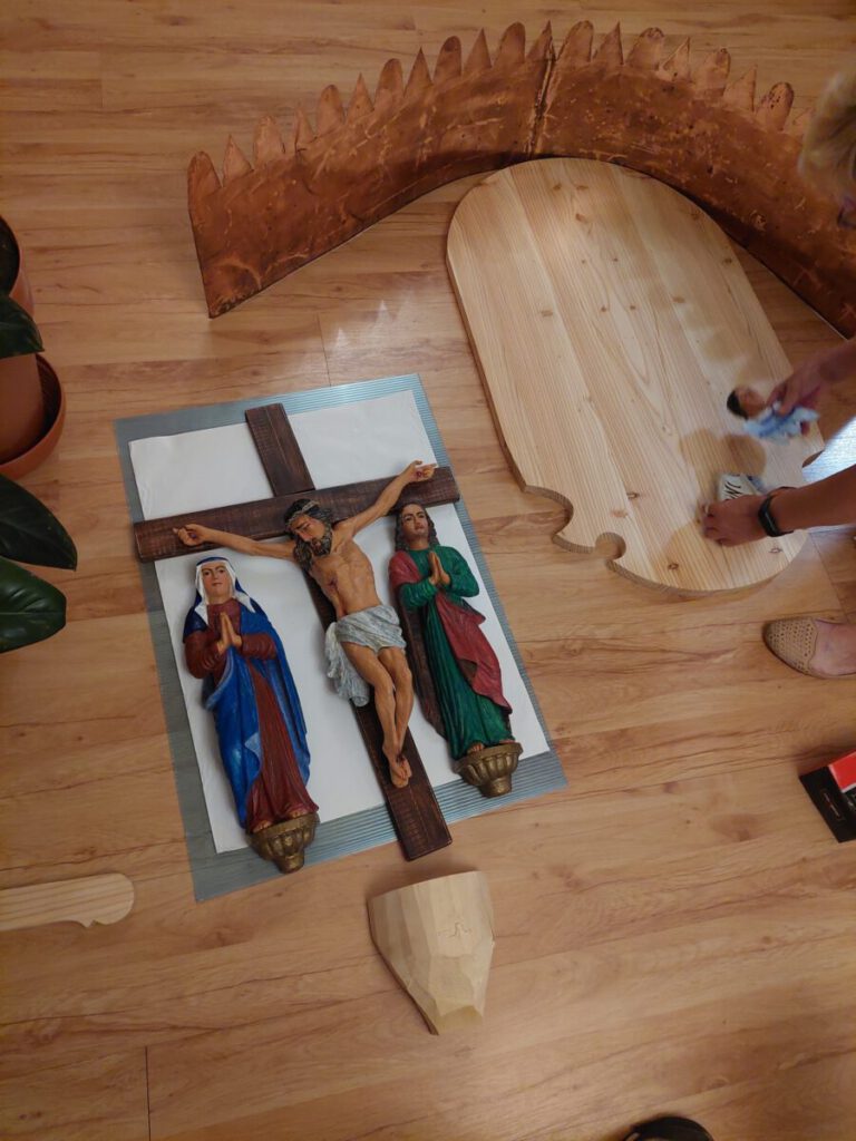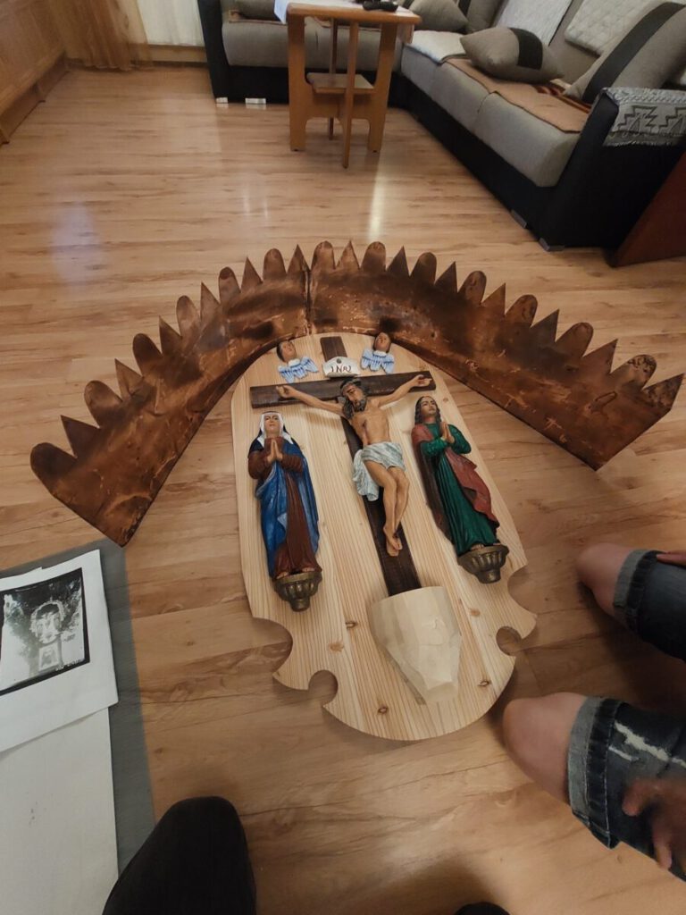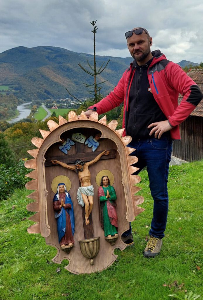 -Dzięki temu, iż mieliśmy oryginalne fotografie z Muzeum Etnograficznego z Krakowa odwzorowaliśmy kapliczkę na wzór z początku XX w. –mówi sołtys Tomasz Koszkul – Na przestrzeni lat jej wygląd – zwłaszcza „szafki” zmieniał się. Także figury dostawały kolejne warstwy farby tracąc swój charakter i blask. Na jednym z załączonych zdjęć można zaobserwować tę metamorfozę. Jest to kapliczka przedstawiająca tzw „pasyjkę”. Chrystus Ukrzyżowany z Matką Boską Bolesną i św Janem Ewangelistą w zwieńczeniu nad krzyżem główki aniołków. Jest to już czwarta kapliczka, która została odnowiona dzięki staraniom naszego Towarzystwa a także przy pomocy wielu osób, które się do tego przyczyniły a szczególnie nasza artystka Pani Maria Buchman, która kolejny raz wykazała się niezwykłą cierpliwością i kunsztem za co jesteśmy wdzięczni. Podziękowania także dla stolarza z Woli Kroguleckiej Adama Gruceli, który pomógł z pracami nad drewnianą szafką nawiązującą charakterem do tej sprzed 120 lat. Blachę miedzianą na daszek ze „strzępami” podarowała firma Metalex ze Starego Sącza, zajmująca się skupem metali kolorowych. Również i ja odświeżyłem sobie po latach jak się rzeźbi w drewnie.