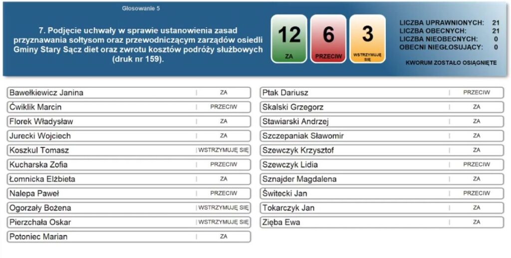 Jak wyglądało głosowanie „ZA” podwyżkami dla sołtysów i przewodniczących osiedli? Prezentujemy głosowanie poniżej.