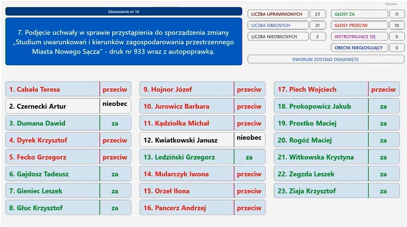 „ZA” głosowało 11 radnych Koalicji Nowosądeckiej, większości radnych Koalicji Obywatelskiej i radnych Sojuszu dla Nowego Sącza. Przeciw było 11 radnych Klubu Prawa i Sprawiedliwości oraz dwóch radnych KO – Grzegorz Fecko oraz i Józef Hojnor. Nieobecni byli radni z Klubu PIS – Artur Czernecki i Janusz Kwiatkowski.