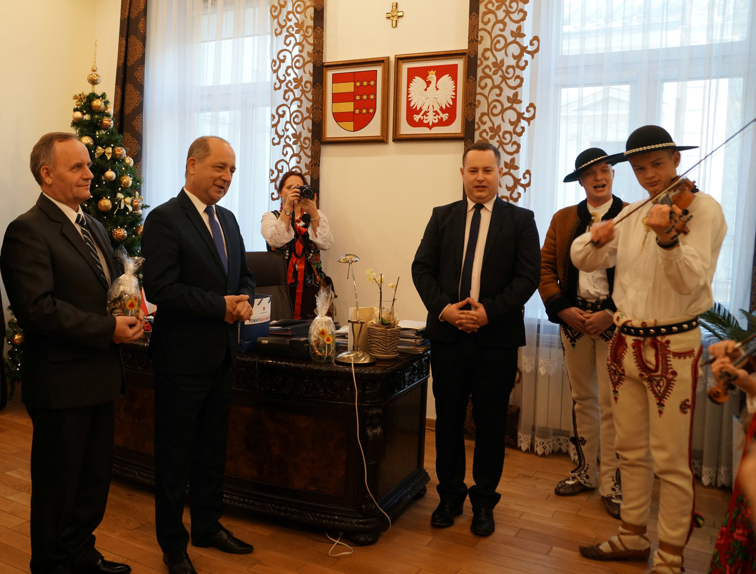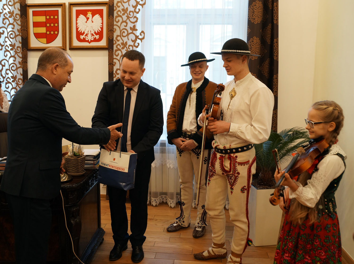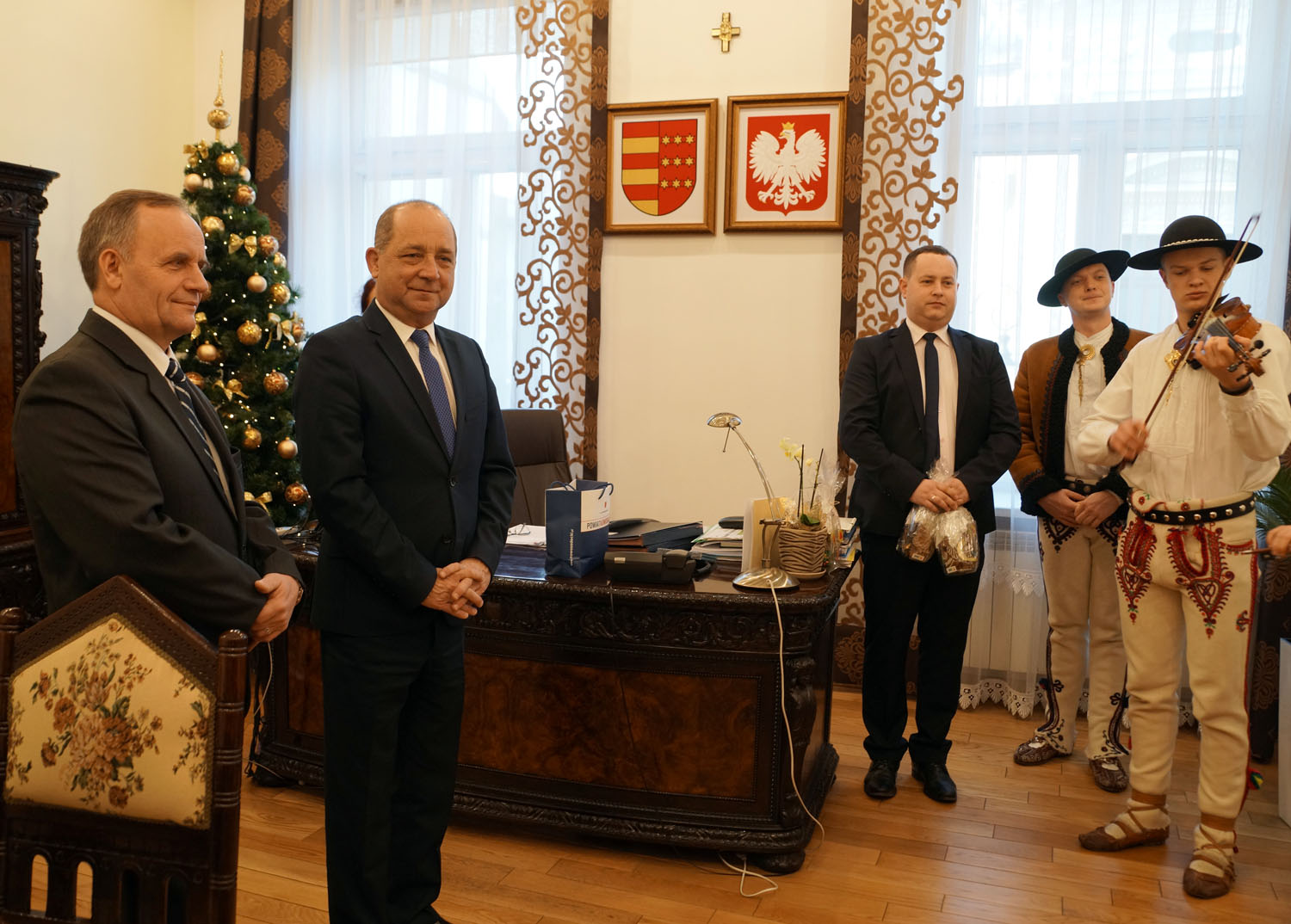 Dziecięca Kapela Regionalna z Powiatowego Młodzieżowego Domu Kultury w Starym Sączu złożyła dzisiaj muzyczne, świąteczne życzenia staroście nowosądeckiemu Markowi Pławiakowi, wicestaroście Antoniemu Koszykowi, członkowi Zarządu Powiatu Marianowi Rybie oraz sekretarzowi Powiatu i radnemu wojewódzkiemu Witoldowi Kozłowskiemu.