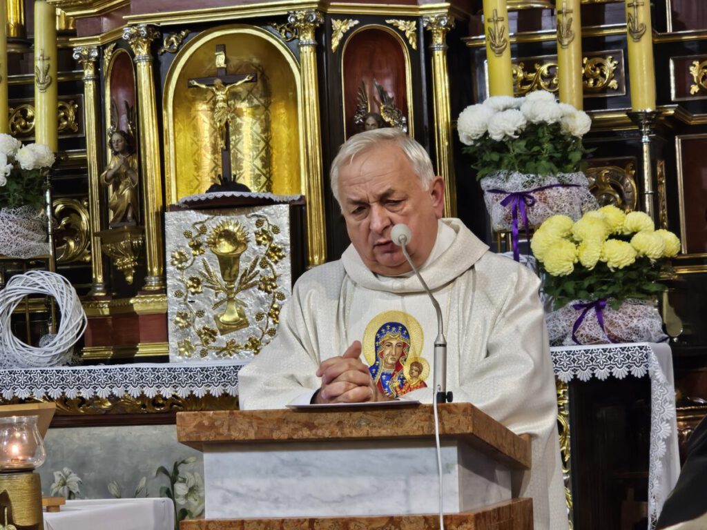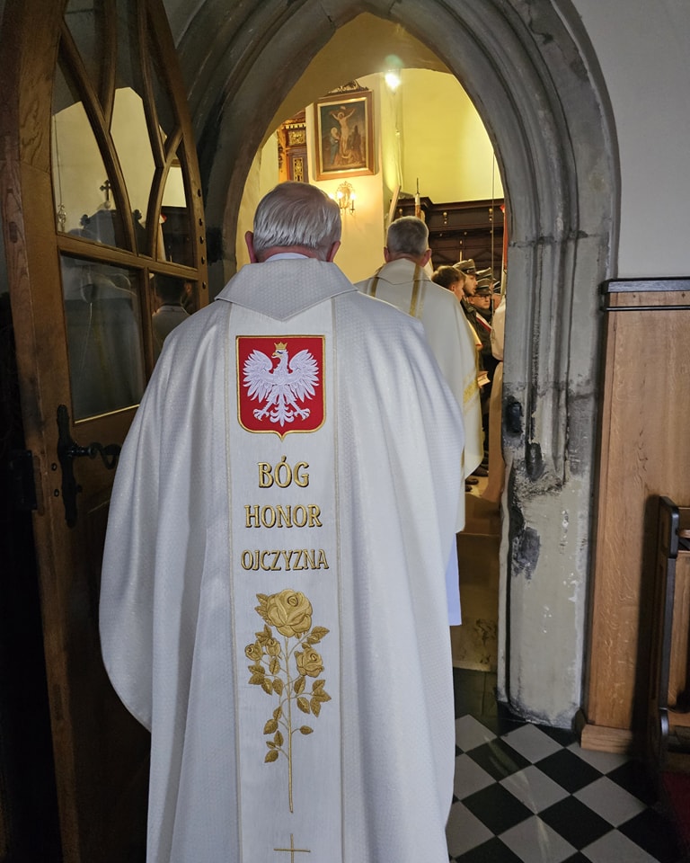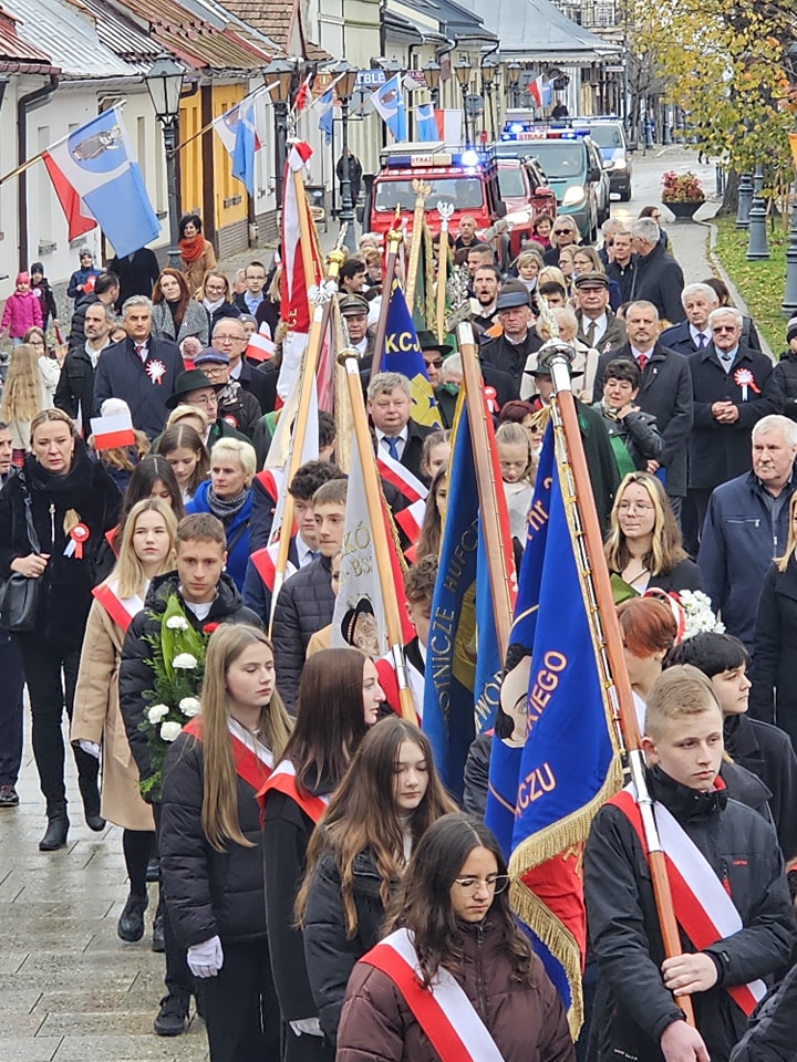 –Obchodzimy niezwykłe święto. To wdzięczność za wolność i państwowość –mówił do zgromadzonych w kościele ks proboszcz Marek Tabor –Taka rocznica powinna napawać wszystkich prawdziwą dumą i radości. Czy takie uczucia mają miejsce i takie nas jednoczą? Odpowiedz powinna być tylko jedna. Czy jest? Wszak wpływowe media skutecznie przekonują, że polskość nienormalność a patriotyzm grozi nacjonalizmem. Patriotyzm nie ma dzisiaj żadnych uzasadnień. Powiedzą, że jest błędnym reliktem przeszłości. Ciemnogrodanie nie powinni się odzywać. Chcąc nas całkowicie wyleczyć z polskości obalą krzyż w przestrzeni publicznej i jak najszybciej go zastąpią…….może tęczą? Politycy narodowi i rodzimi cwaniacy otumaniają naród. Wiek i wykształcenie nie grają tutaj roli. Duchowa miernota sprawia, że dajemy się prowadzić na różnych smyczach zniewolenia. Czy przynależność do elit gwarantuje odpowiedzialność narodową i postawę obywatelską? To święto, które powinno mieć jednoznaczne brzmienie, ma dzisiaj wyraz troski, różnych pytań i lęków i. Trzeba postawić jasno pytanie. Co dzisiaj świętujemy? 105 rocznicę odzyskanie Niepodległości czy może 250 rocznica sejmu rozbiorowego.