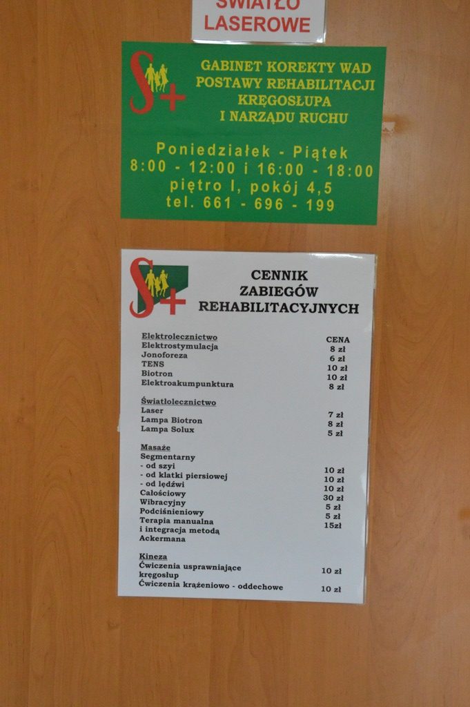Gabinet korekty wad postawy, rehabilitacji kręgosłupa i narządów ruchu proponuje wykonanie trzech zabiegów za symboliczną kwotę 6 zł. Cykl 10 zabiegów to koszt (dla seniora) 60 zł. Dla pozostałych mieszkańców (niebędącymi seniorami) 10-dniowy cykl leczenia wynosi 200 zł. Nie trzeba mieć skierowania ani stać w kolejce do rejestracji. Pacjenci przyjmowani są natychmiast. Oferta rehabilitacyjna jest wyjątkowo bogata. Od września gabinet rozszerzy swoją ofertę o rehabilitację i korektę wad postaw dzieci w wieku szkolnym.