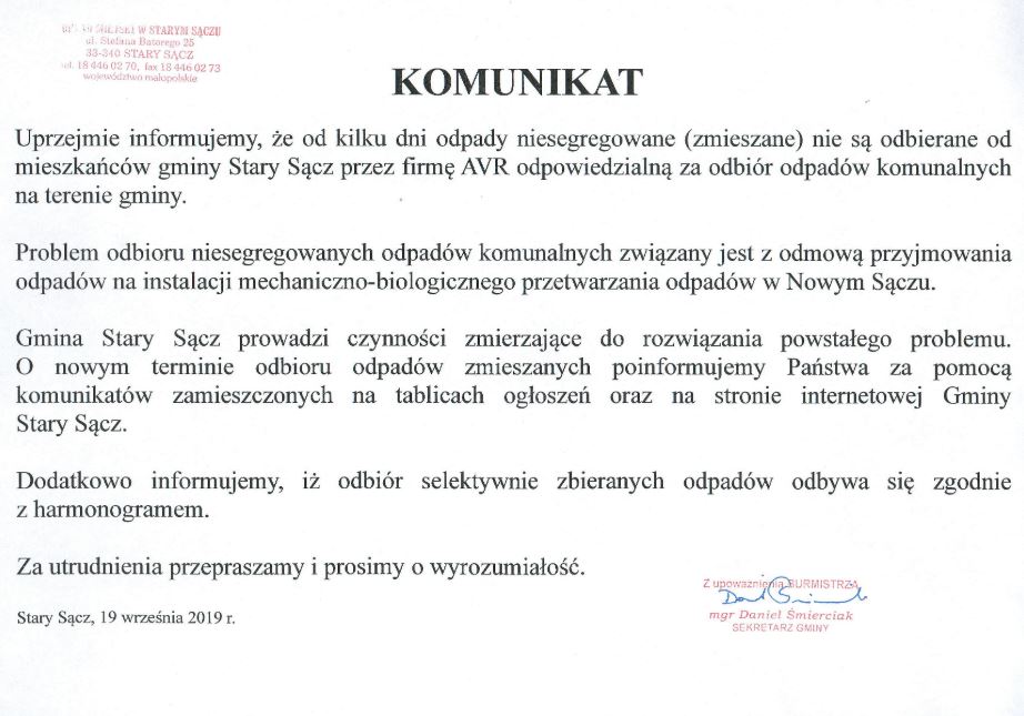 Czy Stary Sącz niczym włoski Neapol zostanie zasypany przez śmieci? Tak się może stać, chociaż w komunikacie Gmina uspokaja i informuje, że prowadzi czynności zamierzające do rozwiązania zaistniałego problemu. W jaki sposób? Gmina zdecydowała się podjąć kroki zmierzające do wykonania zastępczego odbioru odpadów zmieszanych poprzez inną firmę a kosztami obciążyć firmę AVR. Tak jak wynika to z umowy. Problem dotyczy tylko śmieci zmieszanych. Śmieci segregowane zostaną wywiezione przez firmę AVR zgodnie z harmonogramem.