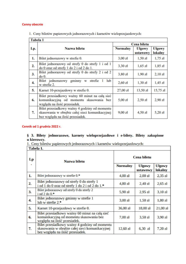 „Kilkanaście ostatnich miesięcy, to jak powszechnie wiadomo czas kumulacji niekorzystnych dla działalności naszego miejskiego przewoźnika okoliczności, spowodowanych najpierw przez pandemię, a następnie regres gospodarczy, którego przejawem jest gwałtowny wzrost cen nośników energii, kosztów pracy i wielu innych. Z danych Miejskiego Przedsiębiorstwa Komunikacyjnego wynika, że w ciągu ostatniego roku średnia cena hurtowa zakupu oleju napędowego wzrosła o 67% (z 3,80 do 6,36 zł netto), a sprężonego gazu ziemnego CNG o ponad 200% (z 2,51 do 7,56 zł netto). Z kolei wzrost kosztów wynagrodzeń (za okres jak wyżej), wynikający m.in. z regulacji w sprawie wysokości minimalnego wynagrodzenia za pracę, kształtuje się na poziomie ok. 13%. (…) W projekcie uchwały zwiększa się zatem ceny biletów jednorazowych średnio o 34,51%, a biletów okresowych i wielookresowych średnio od 41,77 % do 46%, przy czym należy nadmienić, że ceny biletów okresowych (miesięcznych, kwartalnych itd.), nie były podnoszone od 2017 r.”