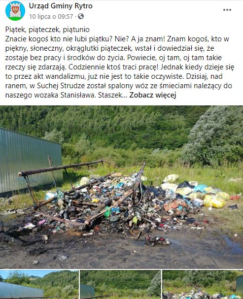 –Dzisiaj, nad ranem, w Suchej Strudze został spalony wóz ze śmieciami należący do naszego wozaka Stanisława -informują pracownicy Urzędu Gminy –Staszek od wielu lat odbierał śmieci od mieszkańców, których domy znajdują się wysoko w górach. Dojeżdżał tam, gdzie śmieciarka nie dała rady. Dojeżdżał, bo nie wiemy, czy będzie to robił nadal, bo zwyczajnie nie ma czym.