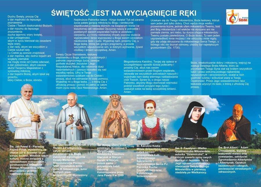 Światowym Dniom Młodzieży w Krakowie towarzyszy instalacja o świętych z Małopolski, m.in. o Stanisławie Papczyńskim i Kindze. W minioną niedzielę ma deptaku w Wieliczce uroczyście otwarto wystawę „Świętość jest na wyciągnięcie reki”, w której centrum jest oryginalna rzeźba krzyża Józefa Lizonia, artysty ludowego z Rogów, gm. Podegrodzie. Rzeźbę długi czas można było podziwiać na starosądeckich błoniach.