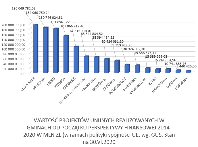 Łączna wartości inwestycji z polityki spójności według stanu na dzień 30 czerwca b.r. wyniosła ponad 472 mld zł. Same tylko gminy naszego powiatu i Nowy Sącz realizowały w tym czasie projekty warte prawie 2 mld złotych.