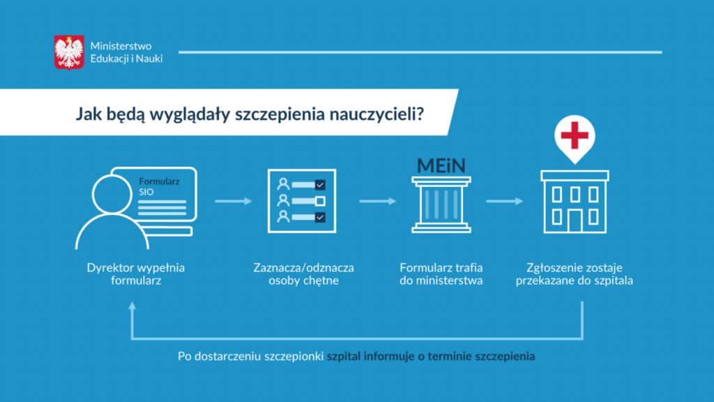 Dyrektor będzie wypełniał w Systemie Informacji Oświatowej prosty formularz, który zostanie udostępniony do poniedziałku, 8 lutego br. w „Strefie Pracownika” SIO. W formularzu, który będzie zawierał wykaz nauczycieli, dyrektor zaznaczy imiona i nazwiska chętnych nauczycieli zatrudnionych w szkole lub placówce, dopisze pracowników nie będących nauczycielami, lub nie zatrudnionych w szkole (chodzi o instruktorów praktycznej nauki zawodu) i wypełniony formularz prześle drogą elektroniczną do Ministerstwa Edukacji i Nauki. Następnie formularz z listą zgłoszoną do szczepienia zostanie przekazany do właściwego szpitala węzłowego. Nazwa szpitala i jego adres będą widoczne w formularzu. Będzie to szpital znajdujący się w najbliższej okolicy danej szkoły i placówki. W momencie dostarczenia szczepionki, szpital przypisany szkole poinformuje dyrektora szkoły lub placówki, kiedy jego pracownicy mogą przyjechać na szczepienie.