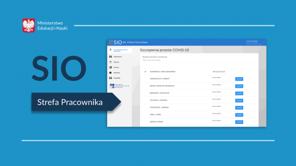 Do poniedziałku, 8 lutego br. dyrektorzy otrzymają w „Strefie Pracownika” Systemu Informacji Oświatowej (SIO) https://strefa.ksdo.gov.pl formularz zgłaszania nauczycieli oraz pracowników niebędących nauczycielami, którzy w pierwszej kolejności będą mogli zostać zaszczepieni. Ministerstwo przekaże również dokładną instrukcję zgłaszania pracowników w strefie dla zalogowanych SIO oraz szczegółową procedurę procesu szczepienia krok po kroku.