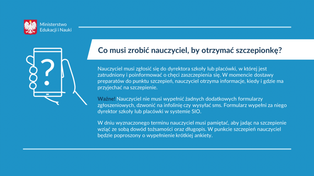 W dniu wyznaczonego terminu nauczyciel musi pamiętać, aby jadąc na szczepienie wziąć ze sobą dowód tożsamości oraz długopis. W punkcie szczepień nauczyciel będzie poproszony o wypełnienie krótkiej ankiety.
