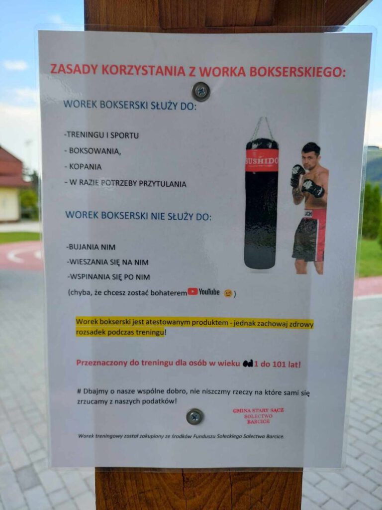 Zamiast niszczyć pobliski plac zabaw i infrastrukturę mogą rozładować swoje emocje na worku treningowym. Sołtys Barcic Tomasz Koszkul wpadł na pomysł, żeby z funduszu sołeckiego zakupić worek bokserski dla młodzieży i zainstalować go w miejscu publicznym.