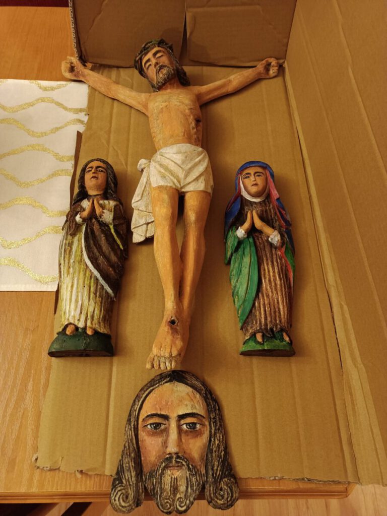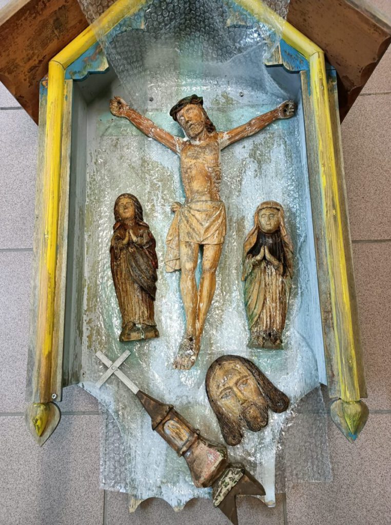 -Figurki jak i częściowo szafka były poddane renowacji gdyż wymagały ratunku tu i teraz. Według szczątkowych opisów do których udało się nam dotrzeć wcześniejsze prace „renowacyjne” były przeprowadzone w latach 60 XX wieku. W późniejszym okresie wykonano także „szafkę” pozostawiając na szczęście niektóre jej elementy jak np wieżyczkę z krzyżem -relacjonuje Tomasz Koszkul – W wnętrzu kapliczki znajdują się ludowe rzeźby: Chrystusa Ukrzyżowanego, Matki Boskiej Bolesnej i św Jana Ewangelisty u dołu płaskorzeźba Twarzy Chrystusa przemienionego. Ufundowana była ok roku 1880 przez rodzinę Bielaków. Od kilku pokoleń opiekę nad nią sprawuje rodzina Olszowskich. Jej lokalizacja to Przysiółek Wdżary a dokładniej róg ulic Wdżary i Kasprzyka.