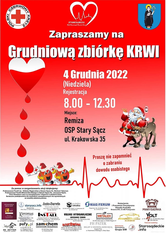 I Ty możesz zostać Świętym Mikołajem, ratując życie! Starosądecki Klub Honorowych Dawców Krwi zaprasza na kolejną Mikołajkową akcję oddawania krwi, która odbędzie się w najbliższą niedzielę 4 grudnia od godziny 8:00 -12:30 w Remizie OSP w Starym Sączu przy ulicy Krakowskiej 35.
