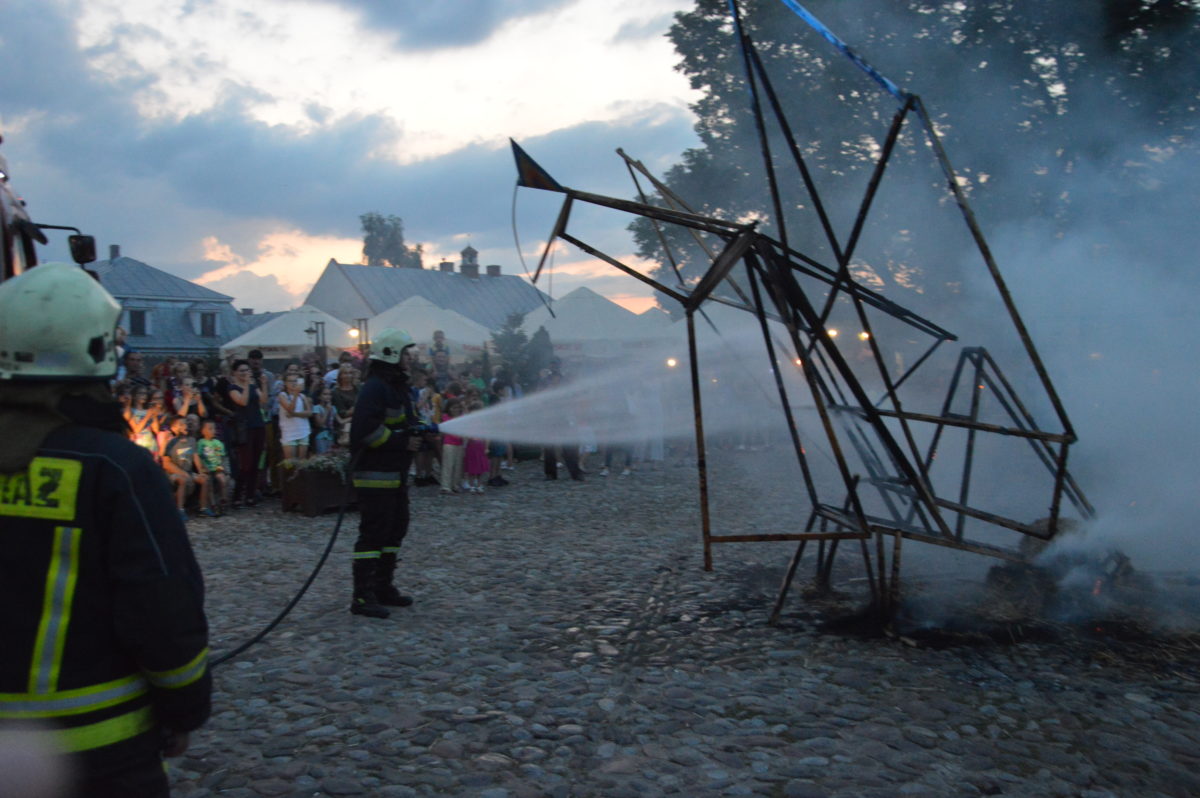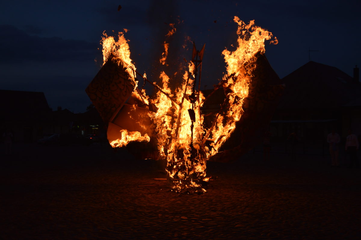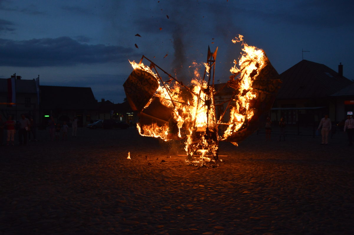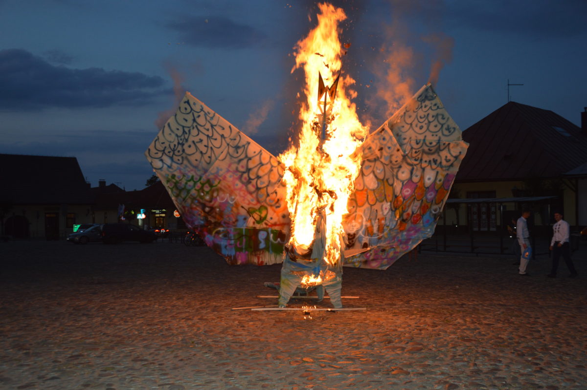 Jak zawsze dwutygodniowy Plener i Sympozjum zakończył się happeningiem na starosądeckim rynku. Tym razem spłonął FENIKS. Nocne spalenie jednego z dzieł powstałych podczas pleneru to tradycja imprezy. W płomieniach zginął wielki feniks. Był to ognisty finał imprezy z udziałem starosądeczan…i druhów z miejscowej OSP, którzy czynnie uczestniczyli w performansie.